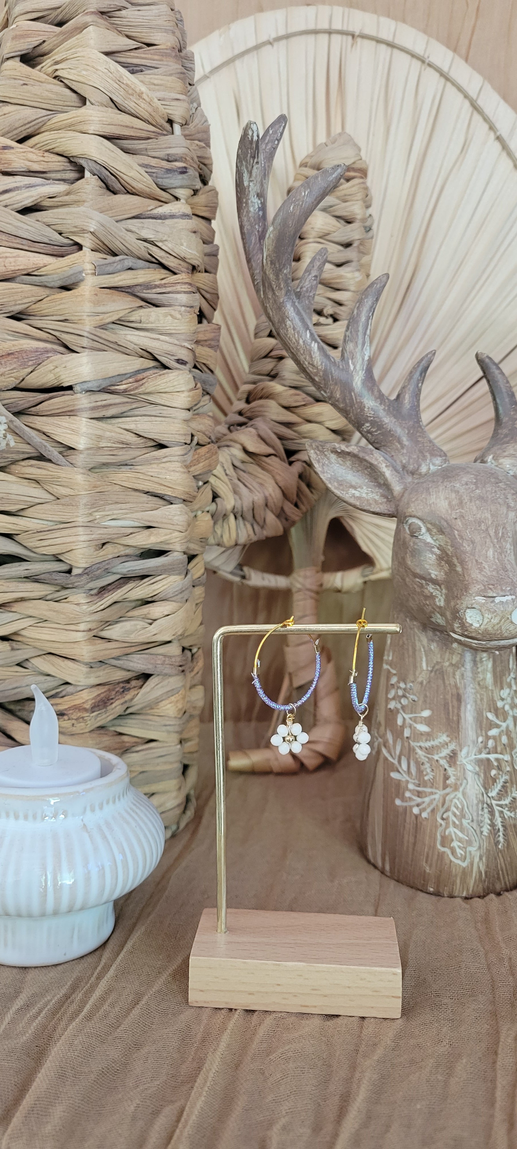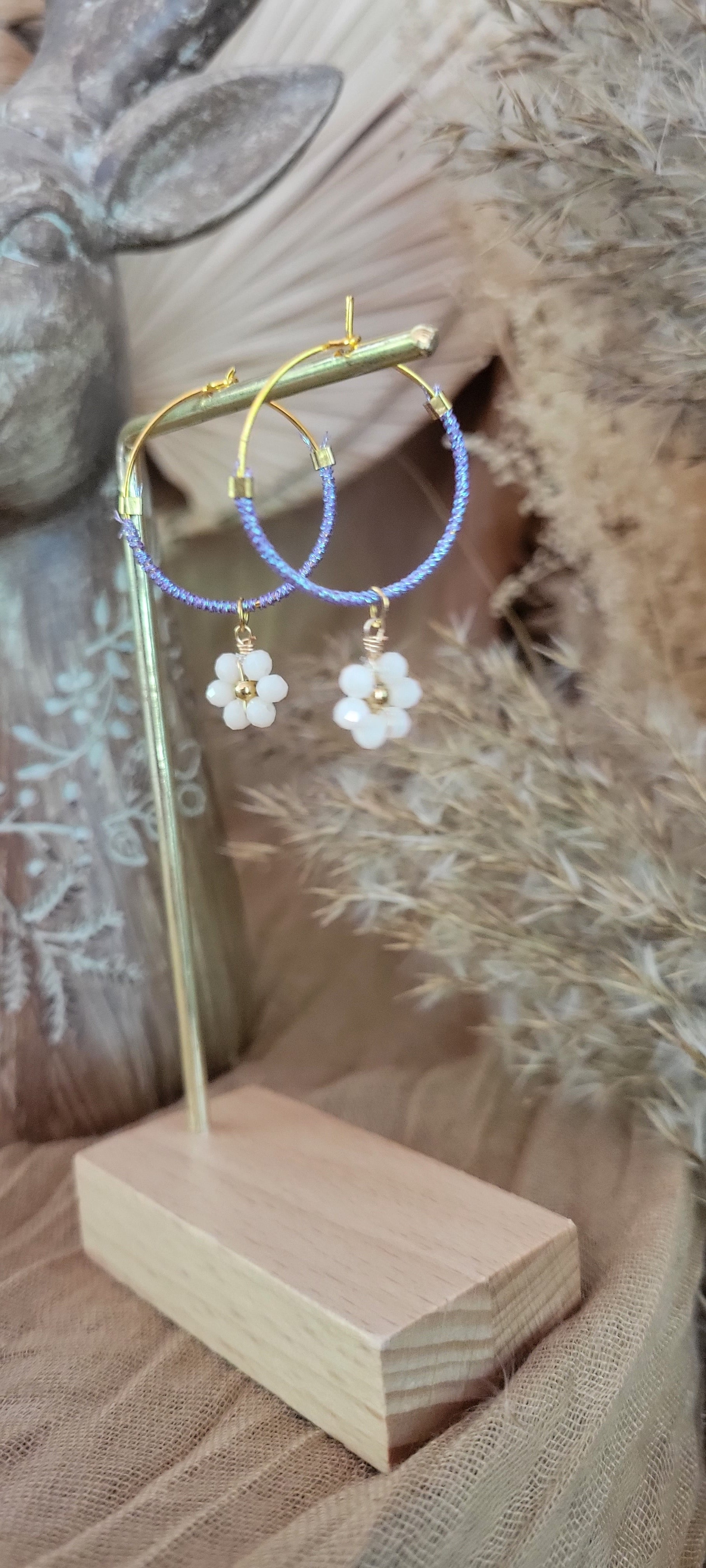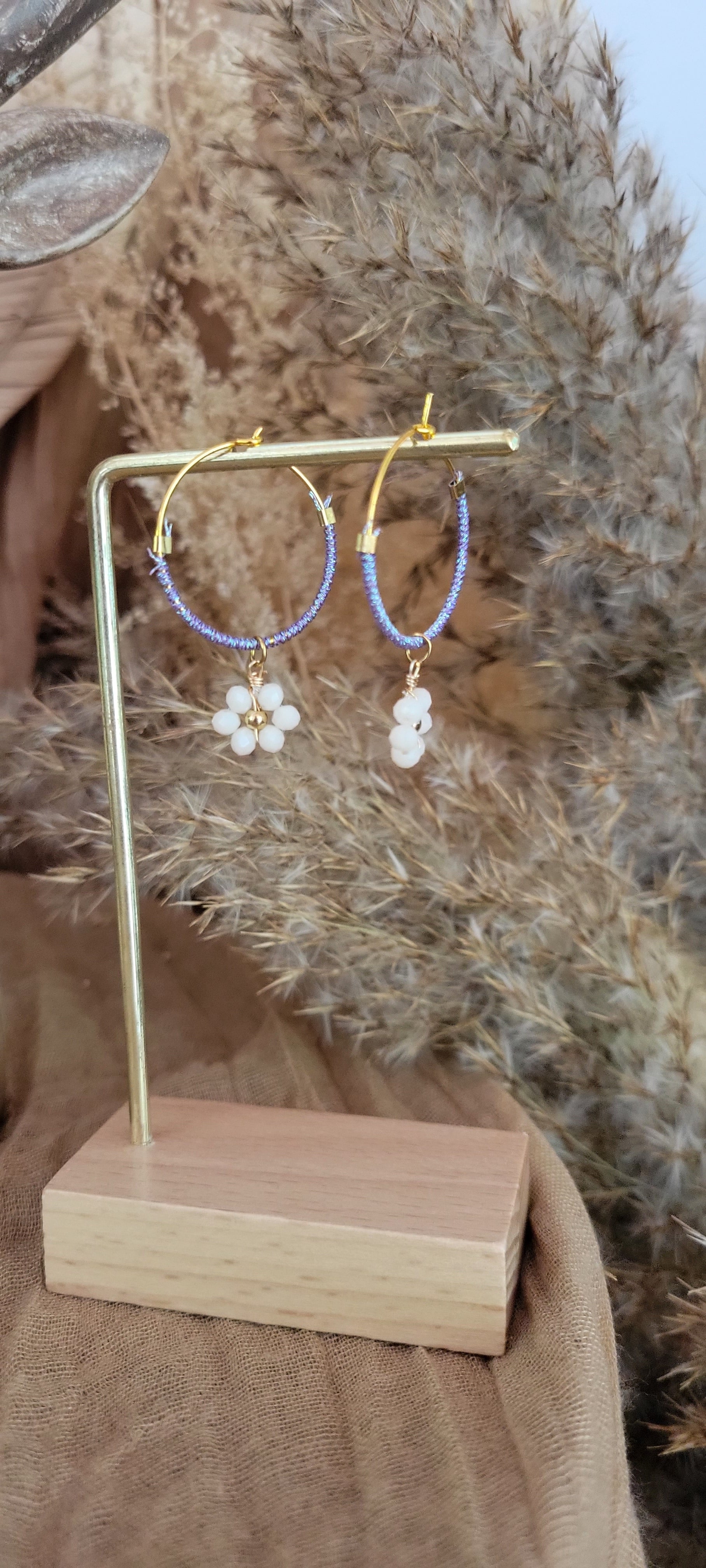 Avec Alba violine, laissez éclore la poésie du matin aux creux de vos oreilles. Cette création délicate mêle l(éclat doré d'un anneau en acier inoxydable la douceur d'un fil violine soigneusement enroulé. En son centre, une petite fleur nacrée formée de perles blanches évoque la fraîcheur d'une rosée florale sous les premiers rayon du jour.