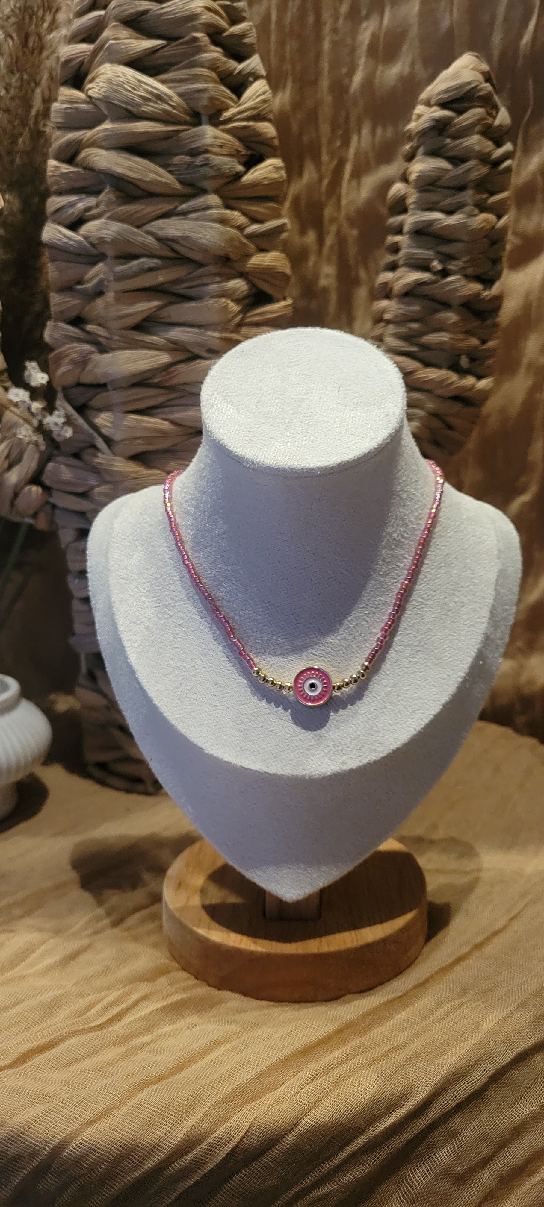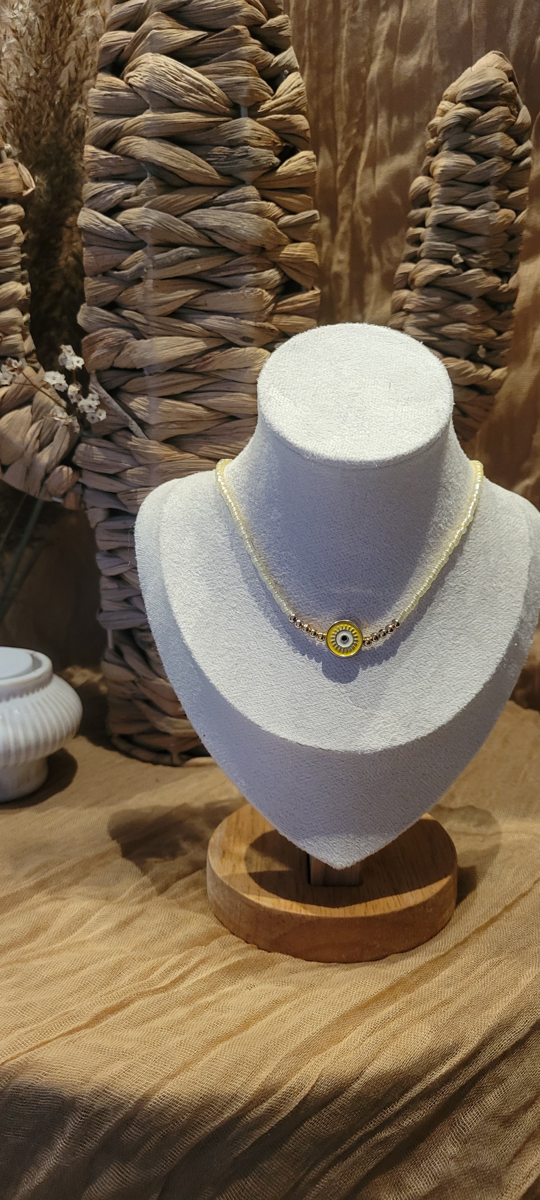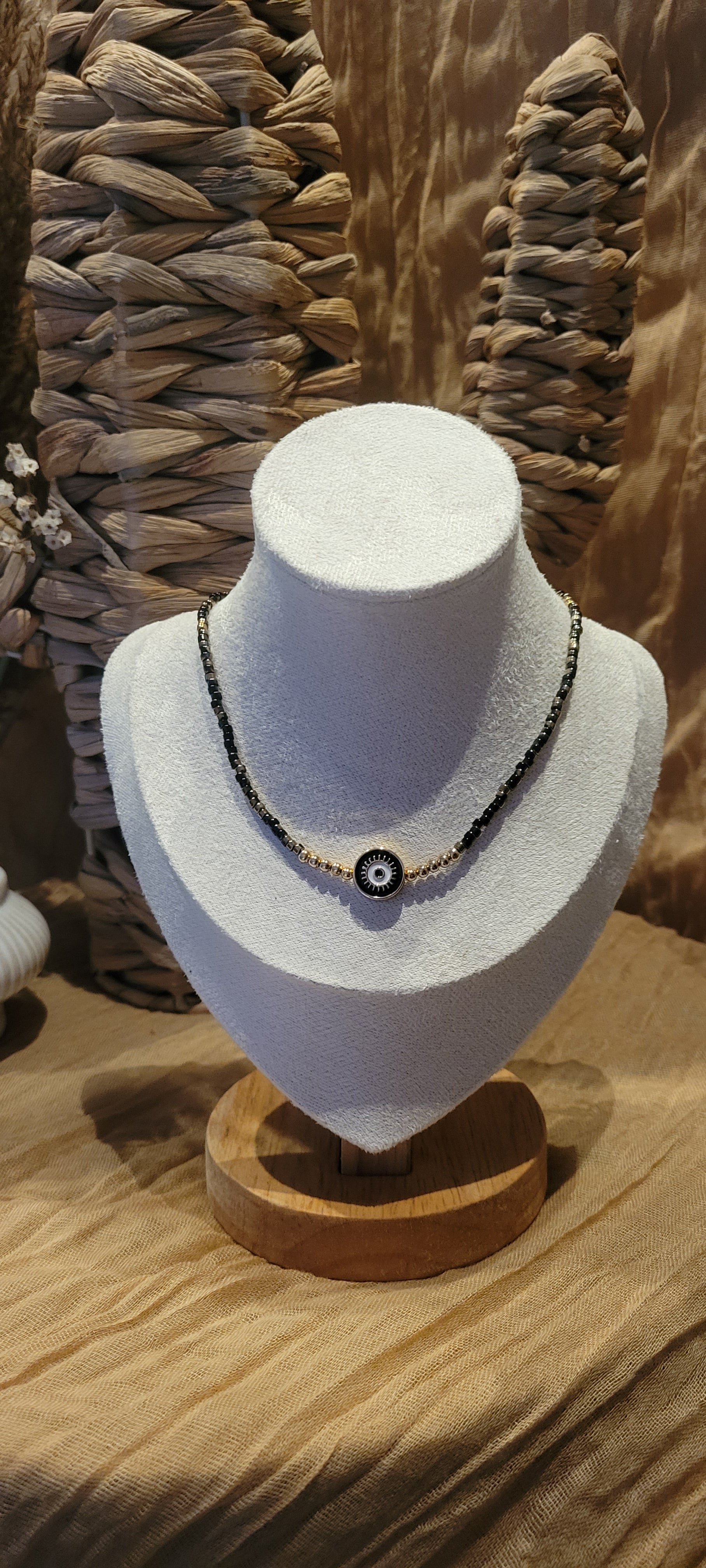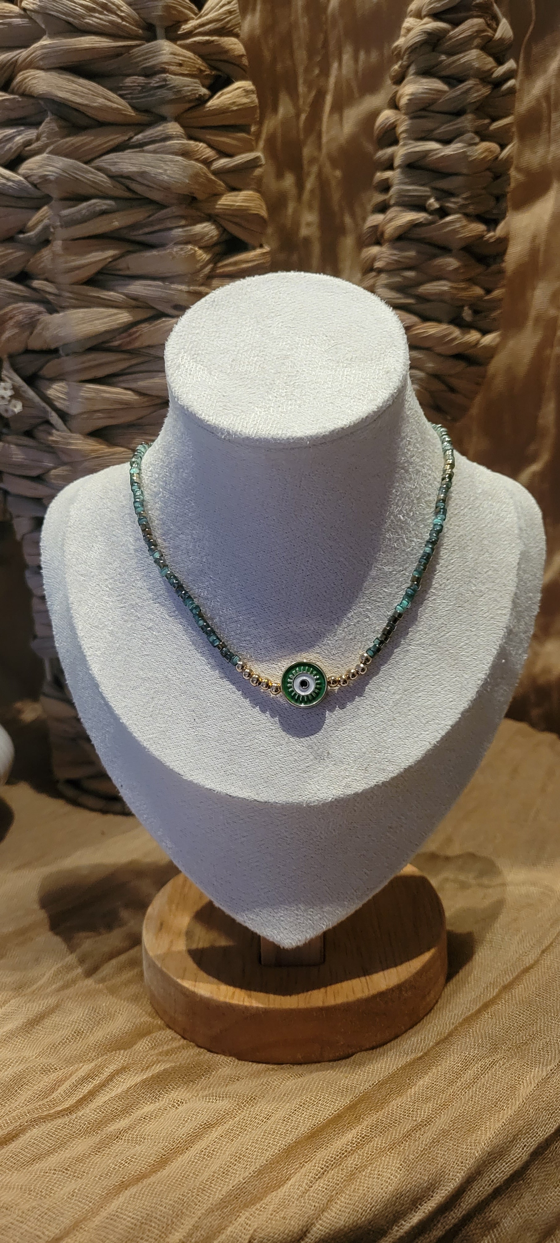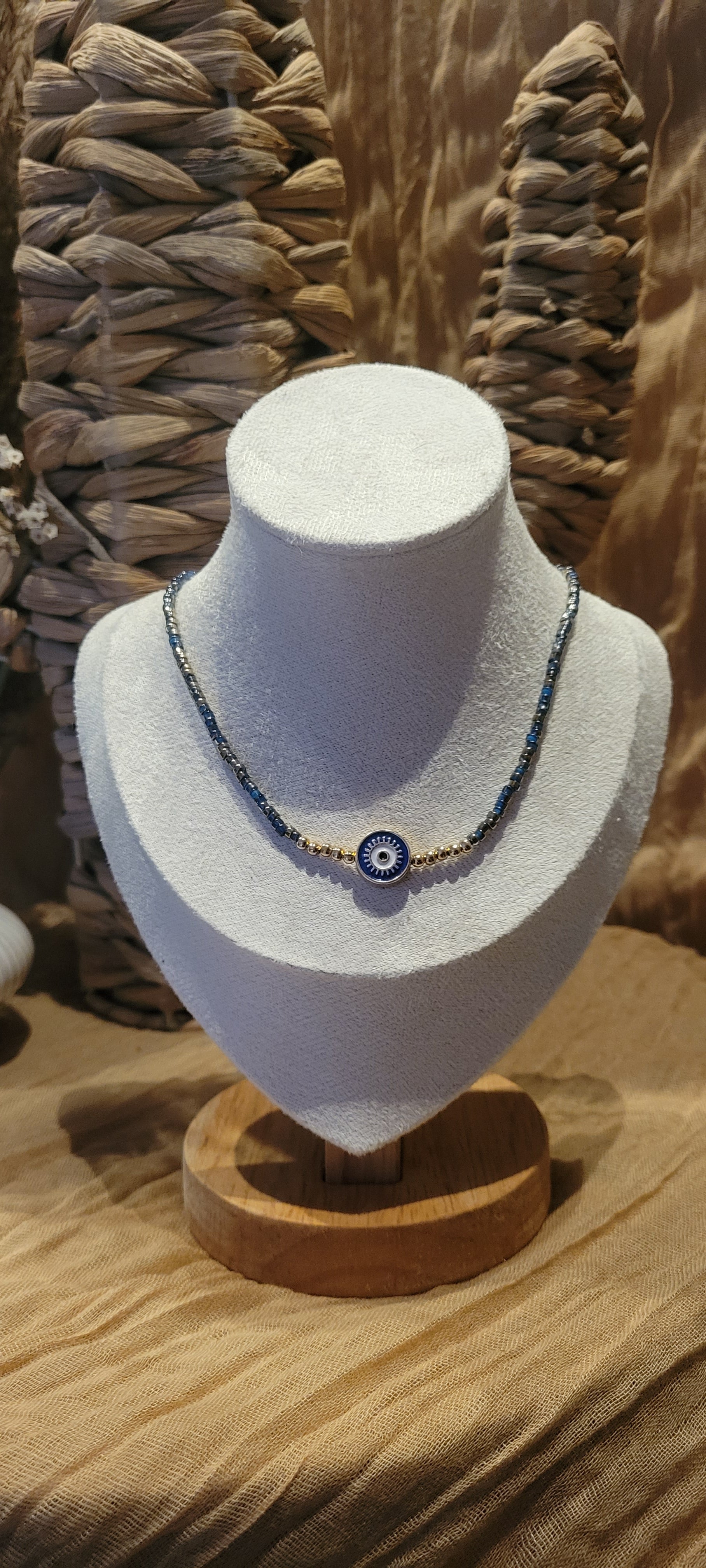 Le collier Aura est une invitation à exprimer sa personnalité tout en portant un symbole de protection. Au centre l'œil et autour des perles créant une harmonie unique - il y en a pour tous les goûts, toutes les humeurs, toutes les "auras".