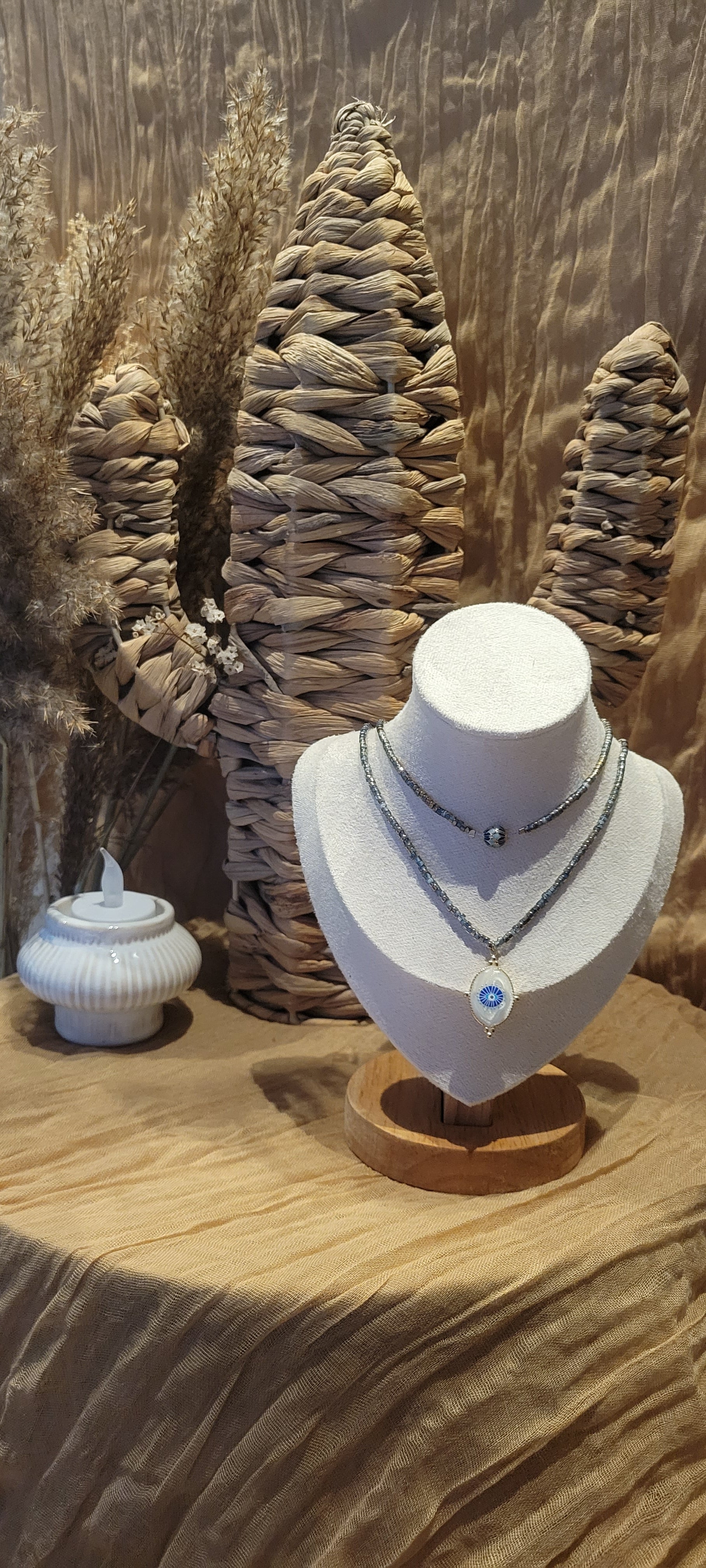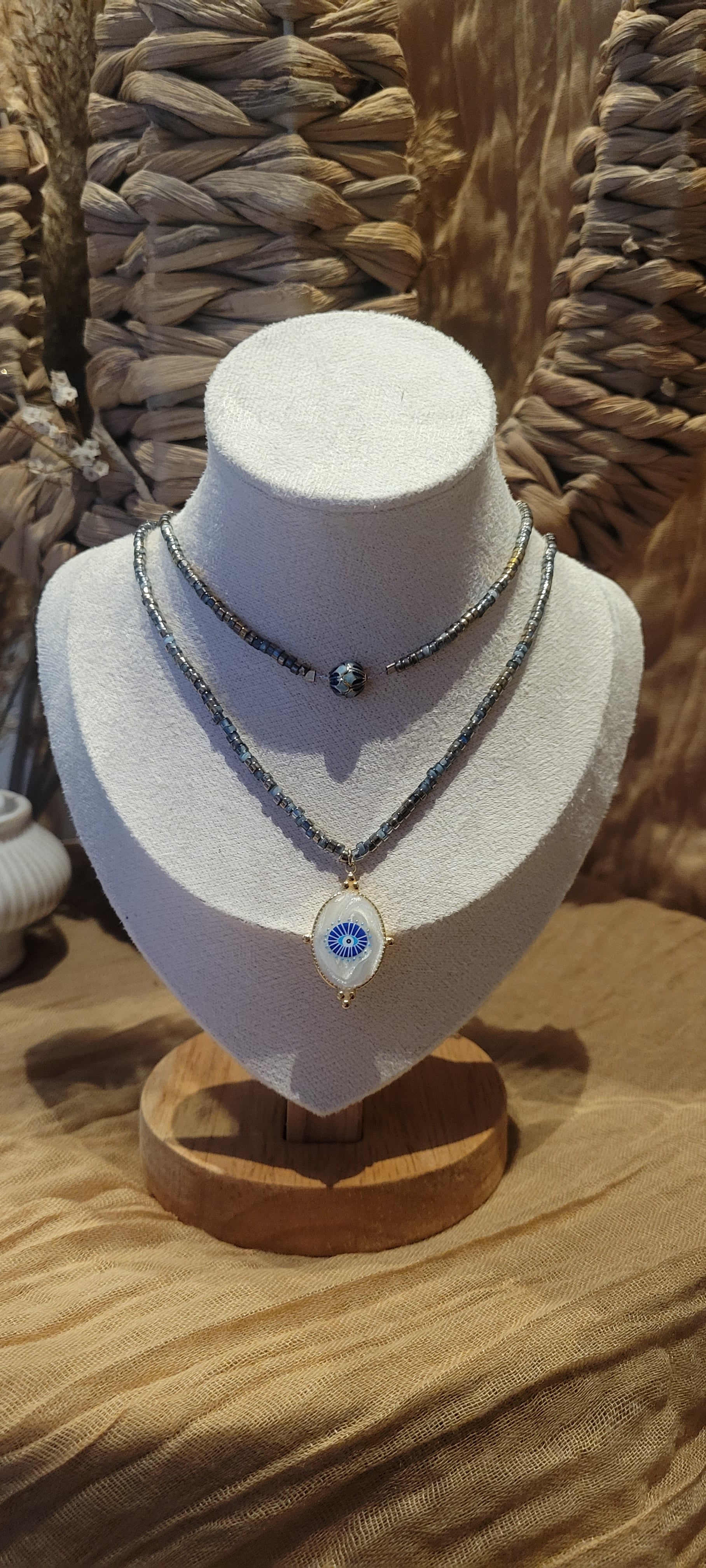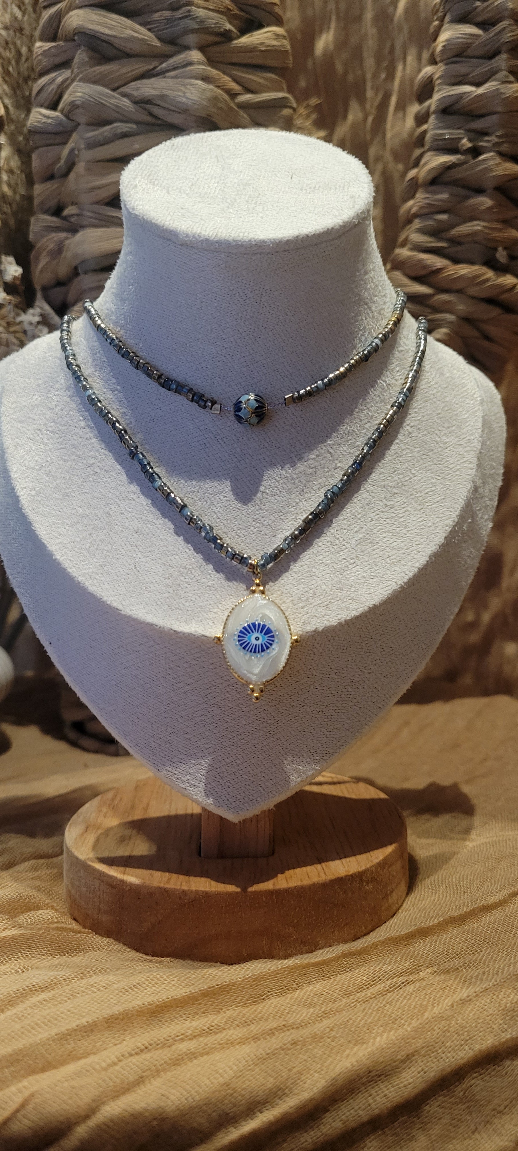 Un collier double tour, ajustable, entièrement façonné à la main. Ses perles bleu-gris rehaussées de touches dorées évoquent les reflets changeant de la mer sous la lumière du soleil. Au cœur du collier, un pendentif blanc nacré orné d'un œil protecteur symbolise bienveillance et sérénité, accompagné d'une perle unique inspiré des traditions ancestrales.