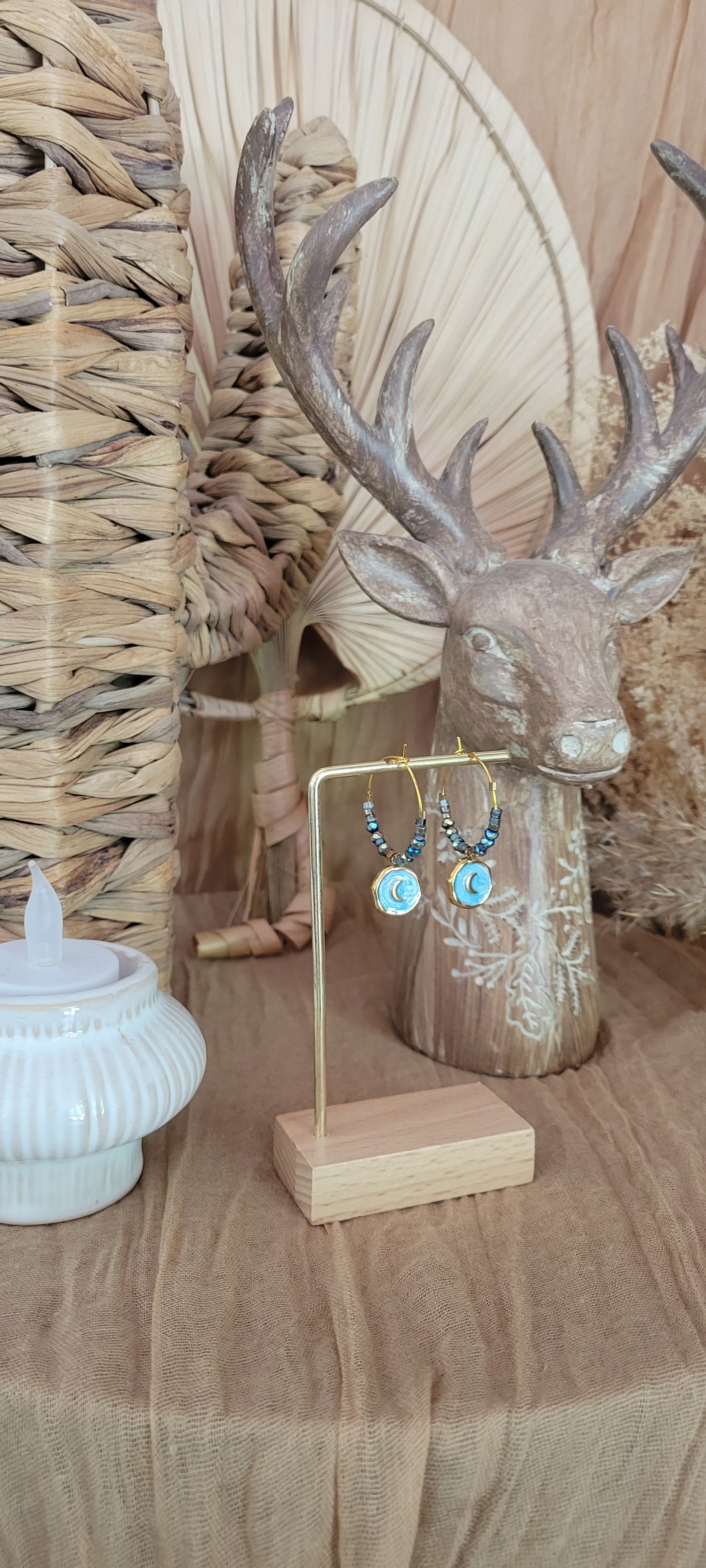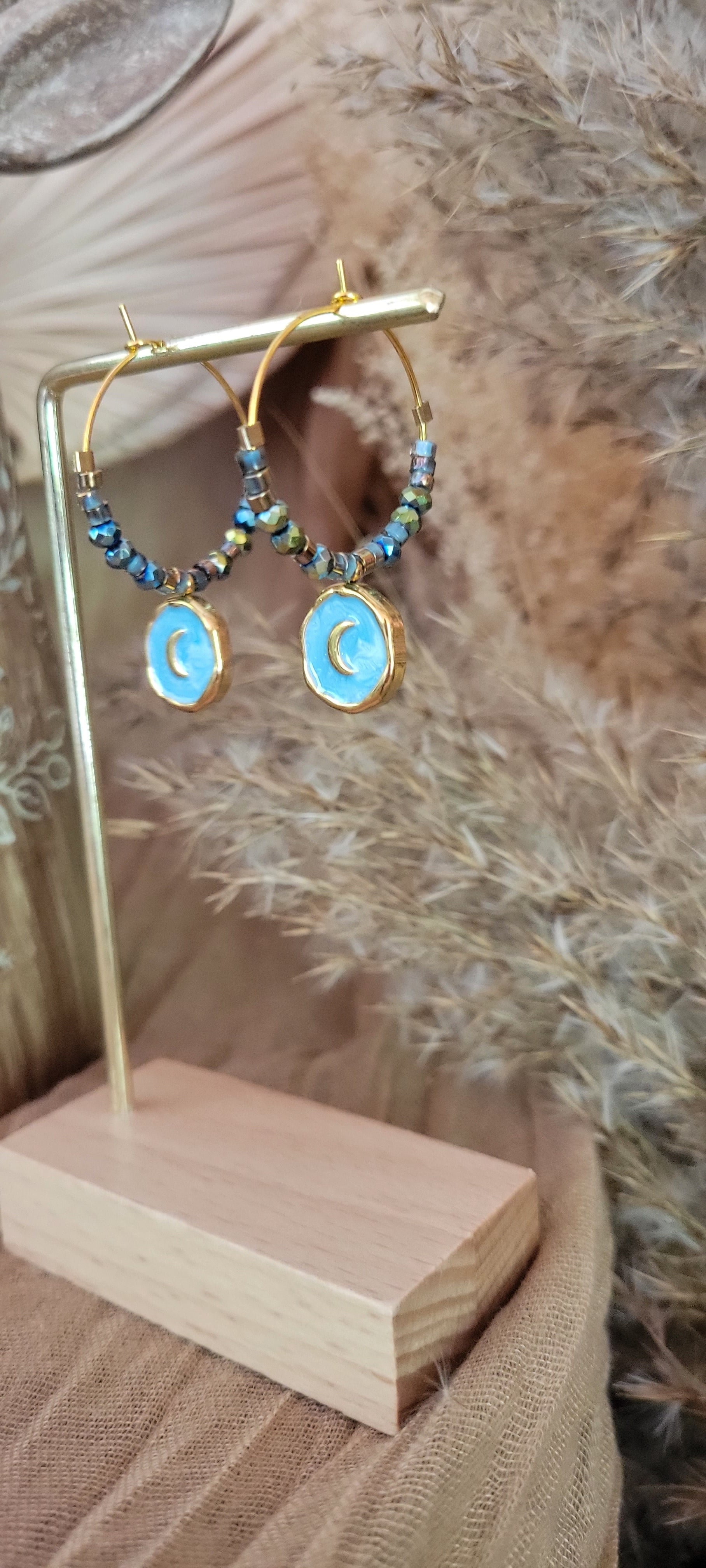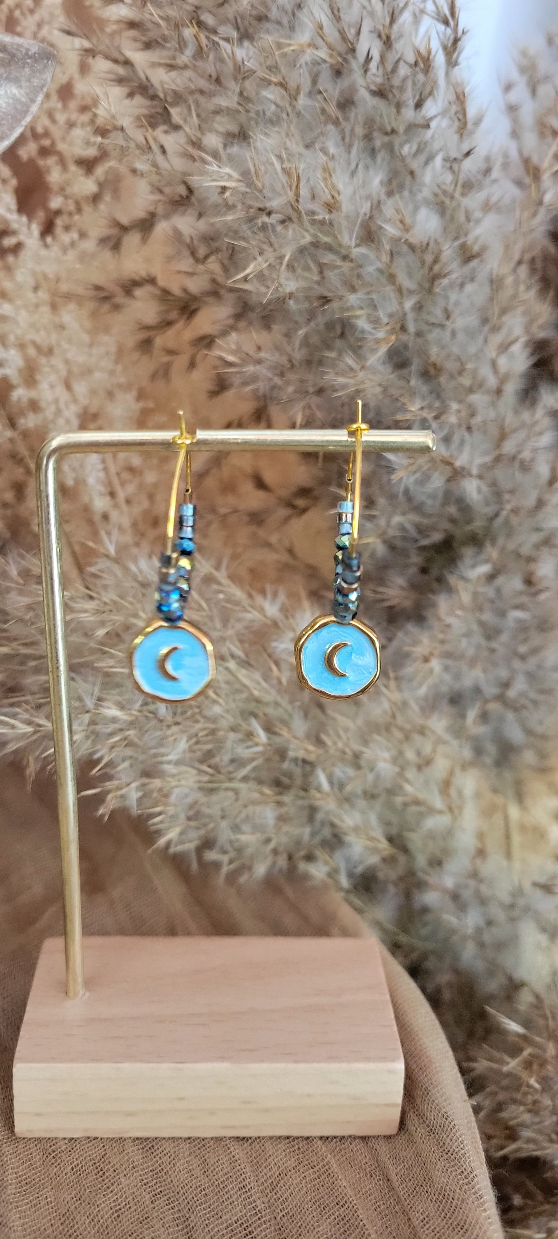Plongez dans un univers céleste avec les boucles d'oreilles Célestine, une création délicate qui allie poésie et éclat. Chaque paire est façonnée à la main avec soin, mêlant des perles irisées à un médaillons bleu ciel orné d'un croissant de lune doré; Lumineuses et légères, les célestine capturent la douceur des nuits étoilées et apportent une touche de mystère à votre tenue.