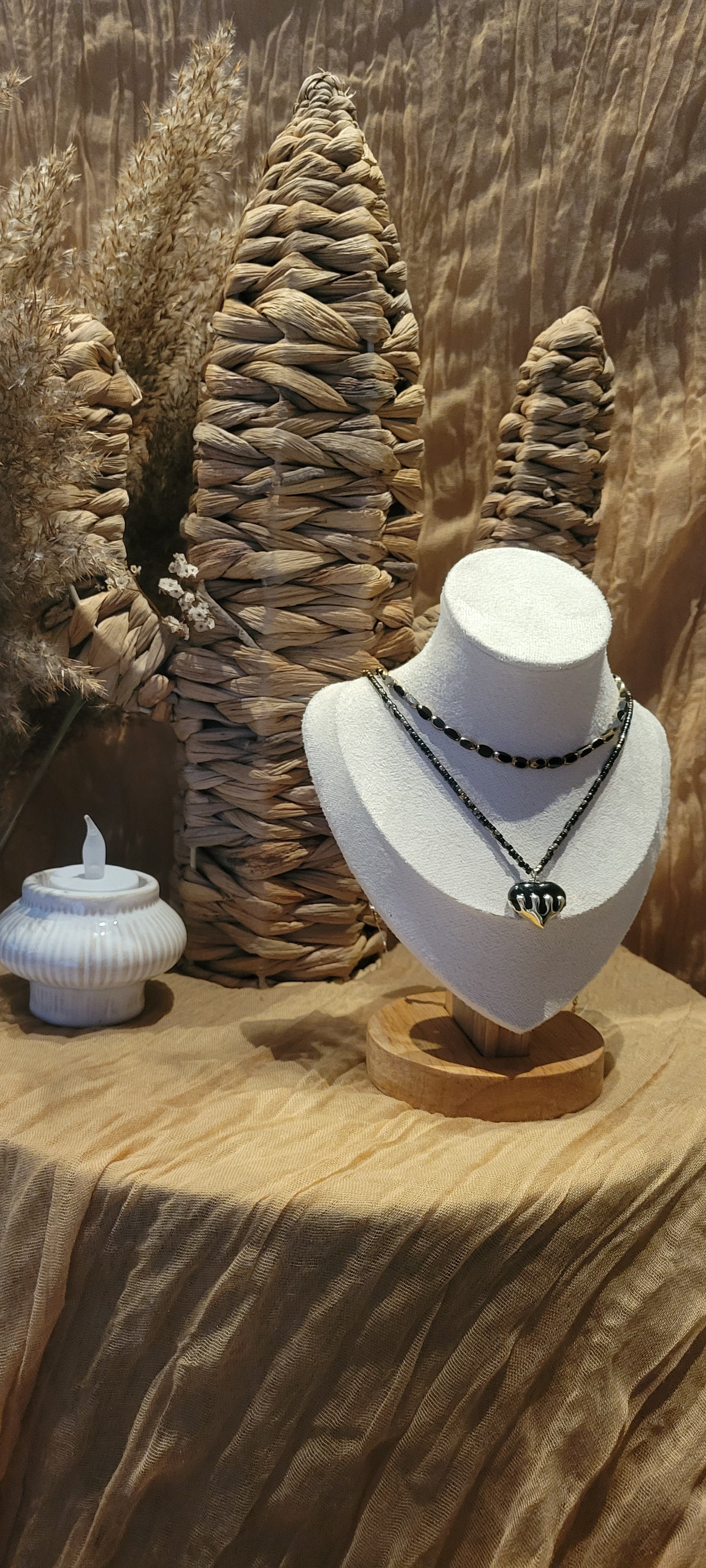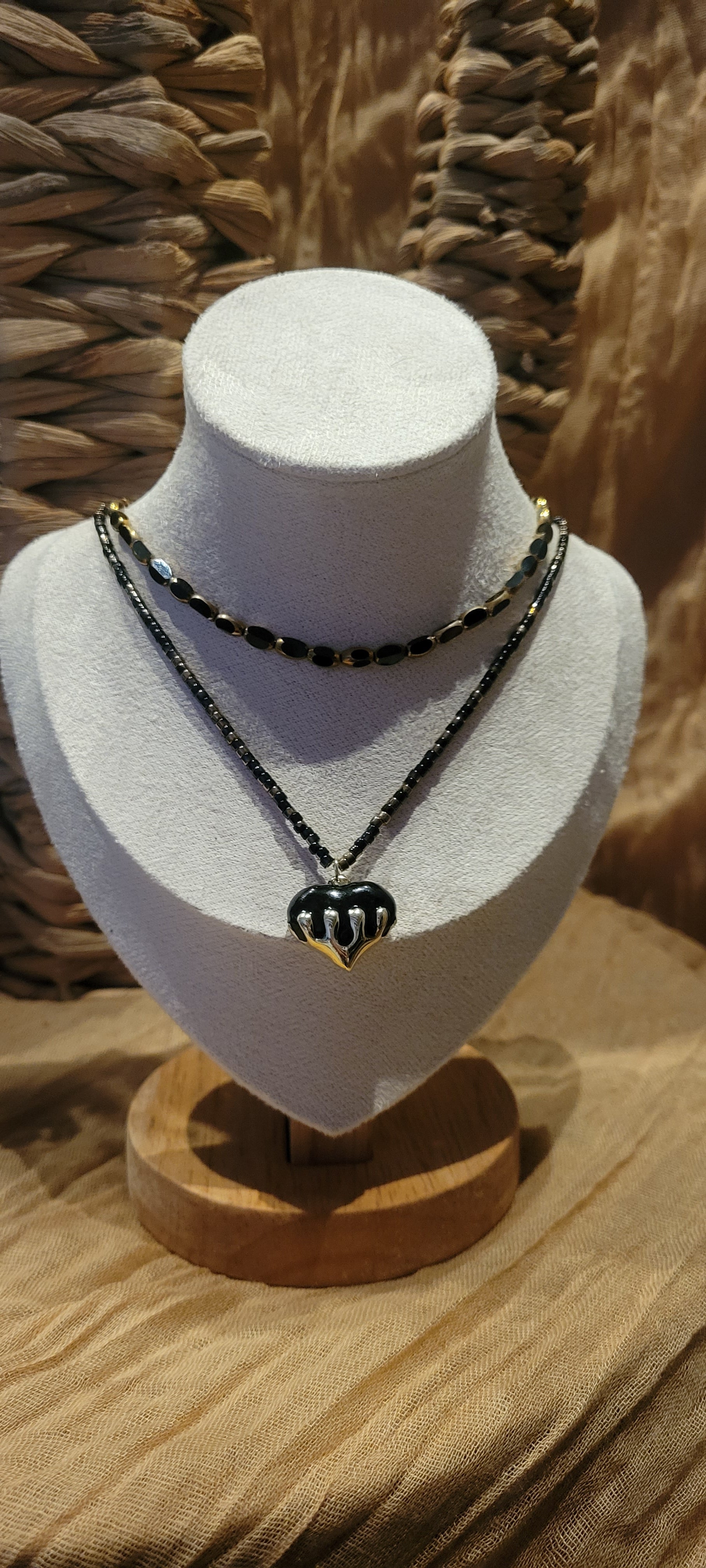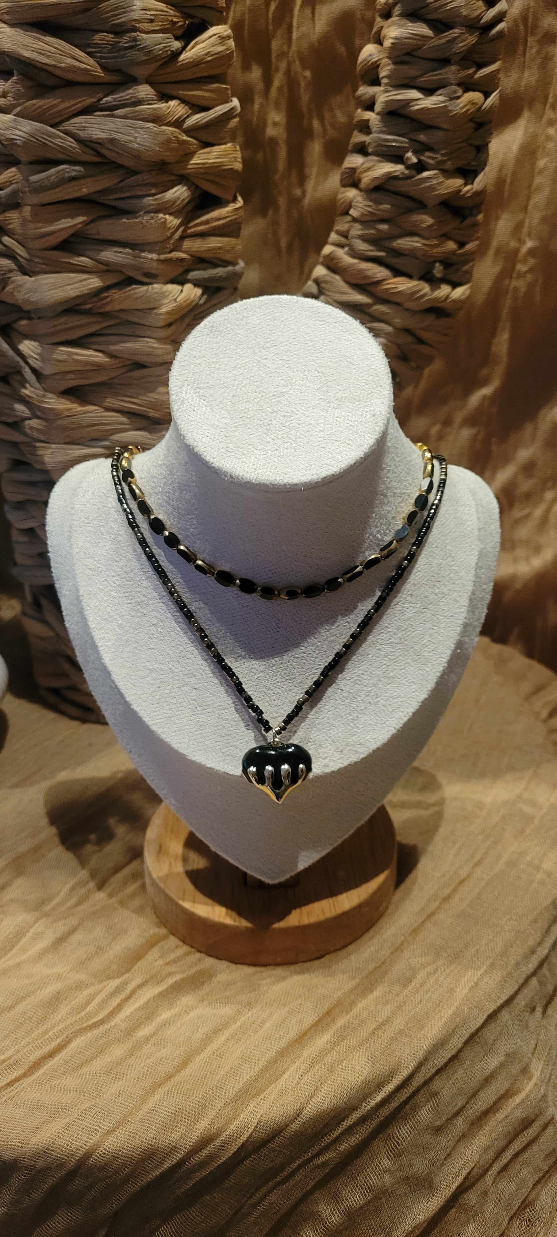 Ce collier à double tour allie la profondeur mystérieuse des perles ovales noires d’un ras-le-cou à la finesse élégante des perles noires et dorées du second tour. En son centre, un imposant pendentif en forme de cœur noir et or captive le regard, symbolisant à la fois la force et la passion. Cœur Ébène est une pièce audacieuse et sophistiquée, parfaite pour celles qui veulent affirmer leur style avec un charme intense et une touche d’élégance intemporelle.