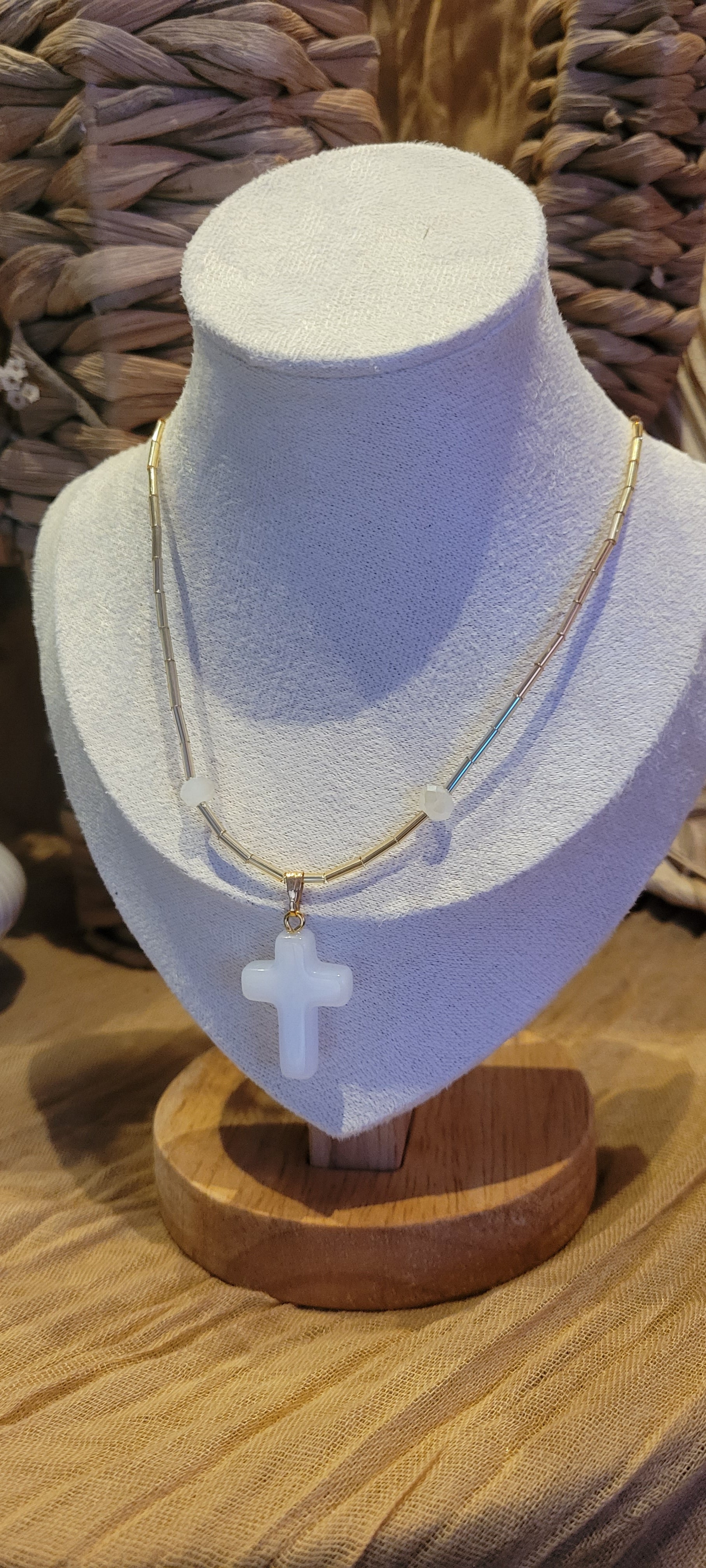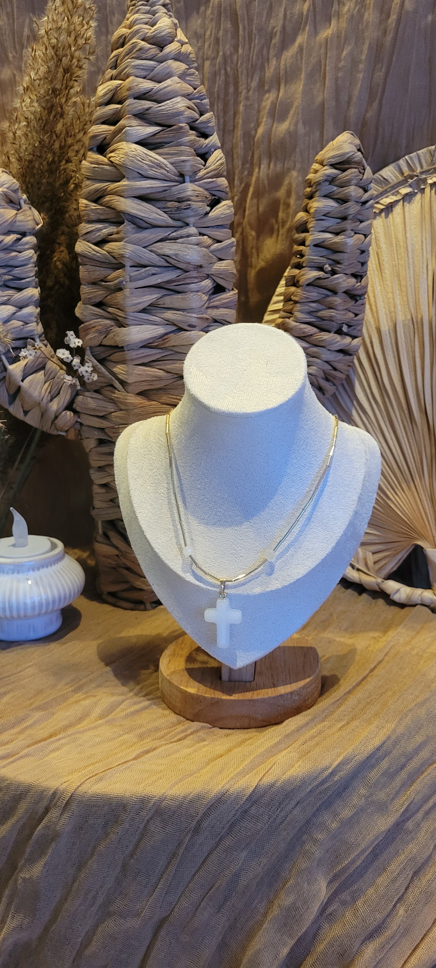 Eclat divin est un collier délicat et lumineux, ornée d'une croix blanche nacrée suspendue à un fil de perles dorées fines. Symbole de paix et de pureté, ce bijou incarne l'élégance et la spiritualité moderne. Parfait pour sublimer une tenue avec une touche sacrée et minimaliste, il se porte aussi bien au quotidien, que pour des occasions spéciales.