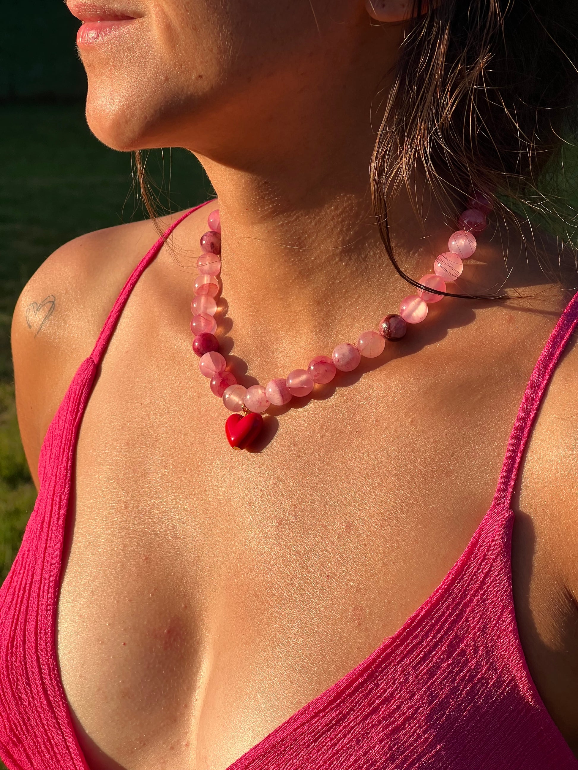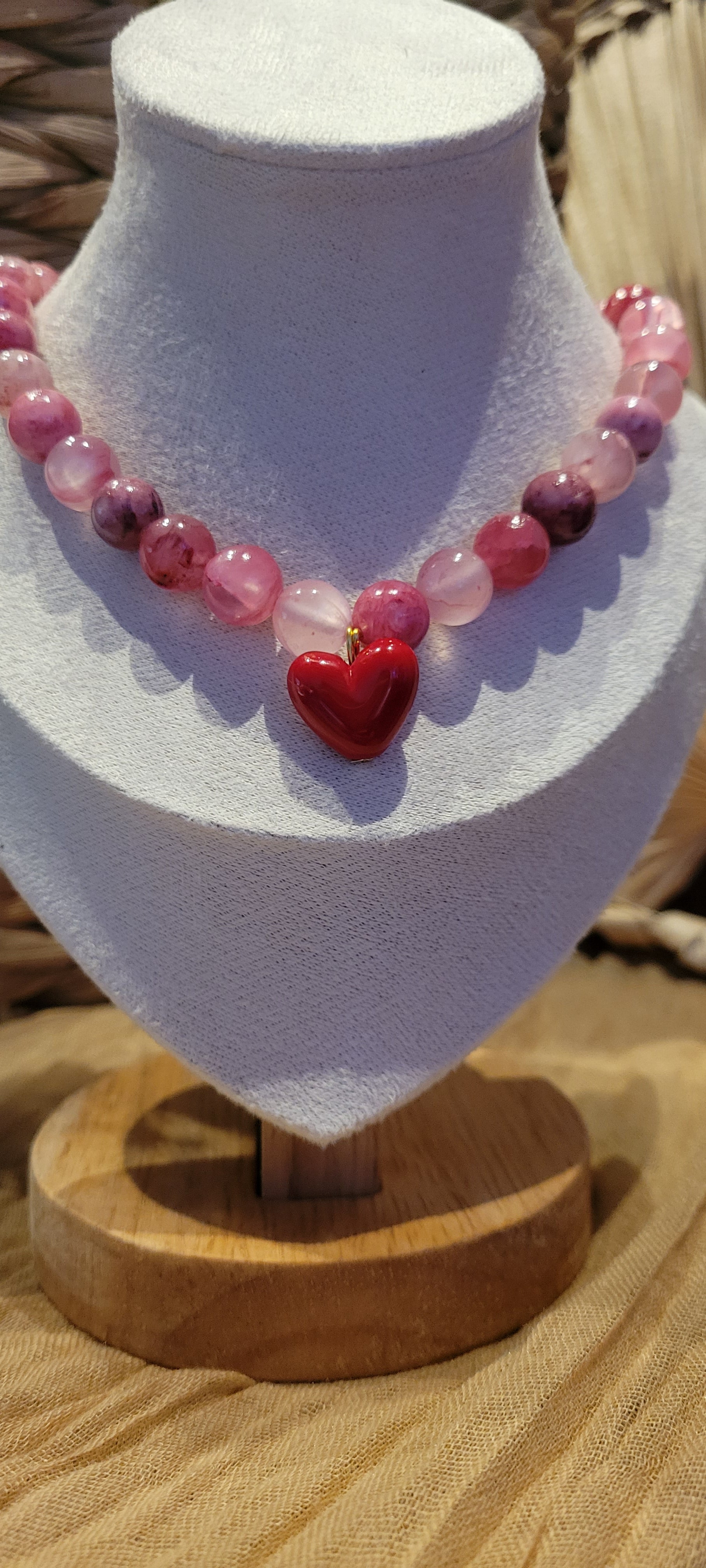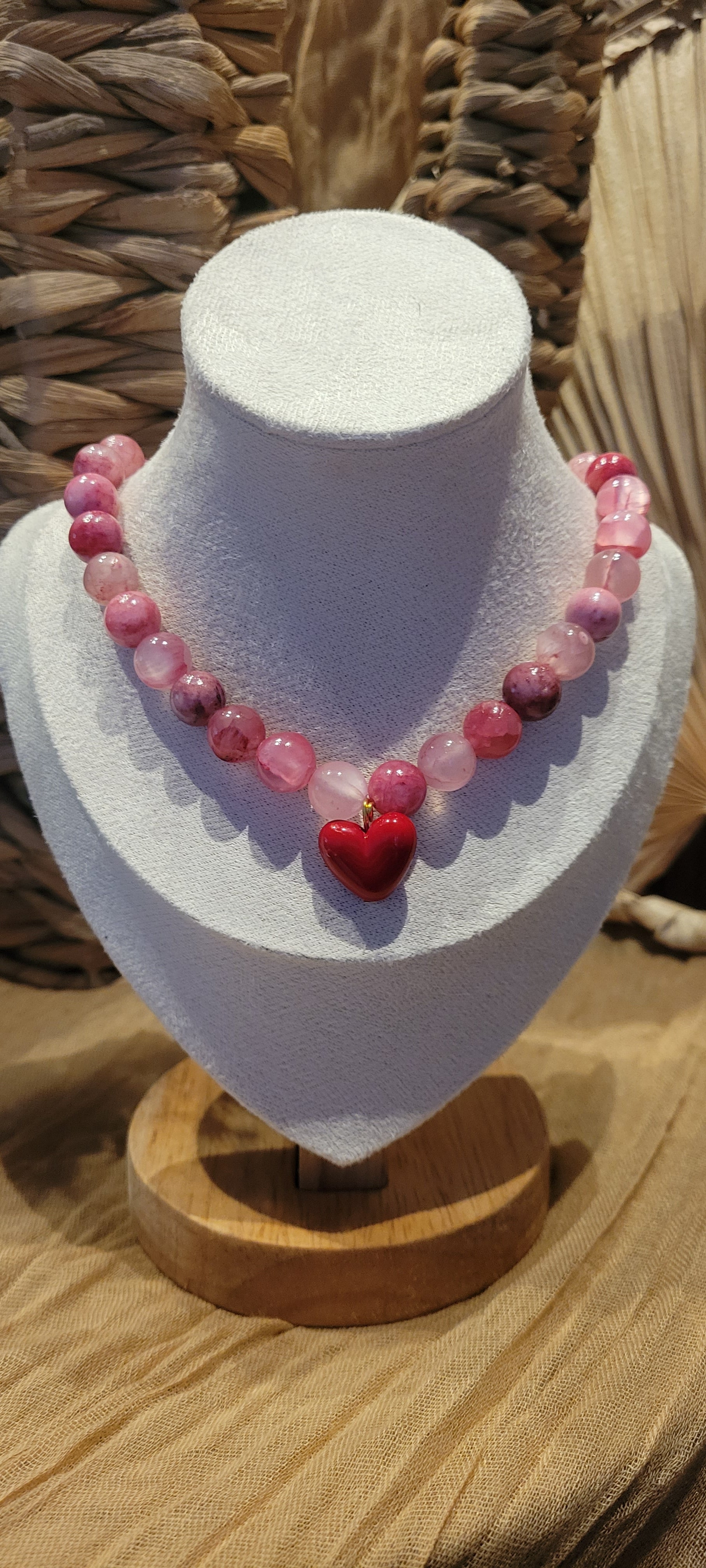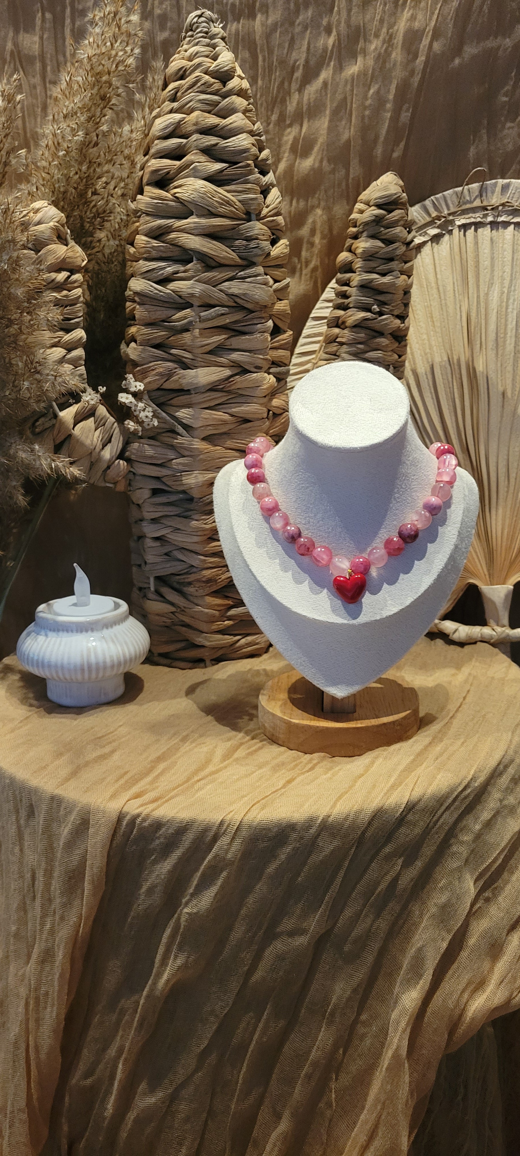 L'expression subtile de la romance et du raffinement. Succombez à la délicatesse et à la passion avec le collier élégance amoureuse, une création qui combine la douceur des perles roses et la chaleur d'un cœur rouge. Chaque grosse perle rose reflète une lumière douce et envoûtante, tandis que le pendentif en forme de cœur apporte une touche romantique et audacieuse, symbole d'amour et de désir.