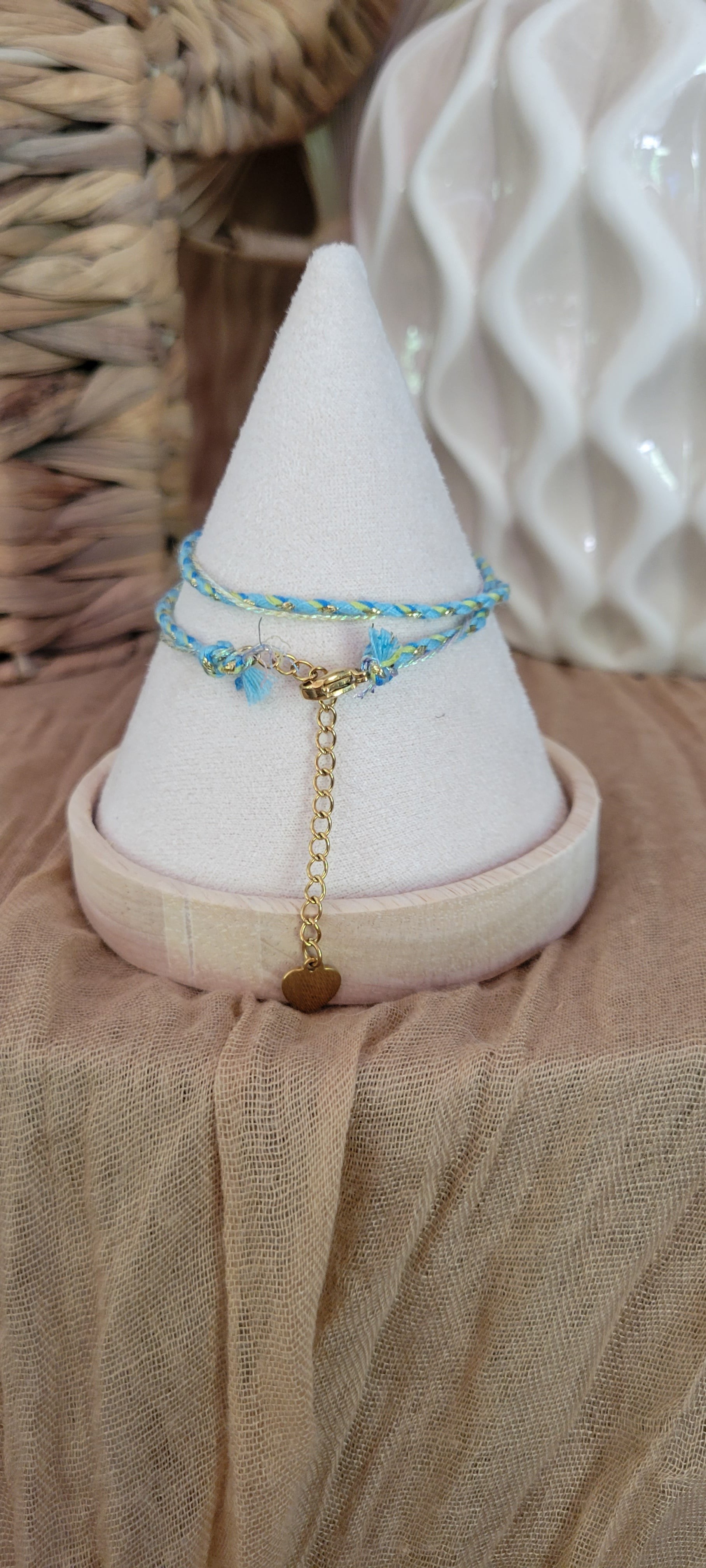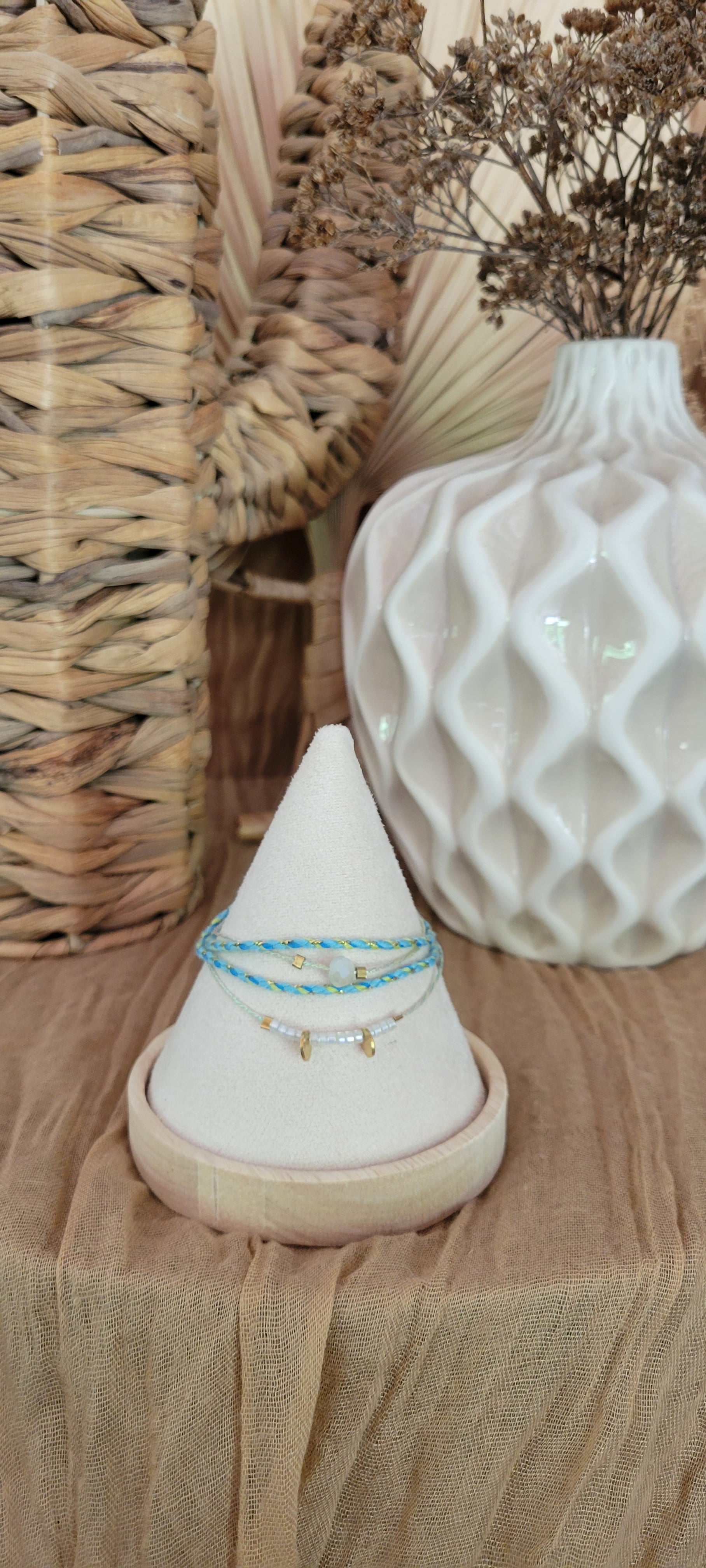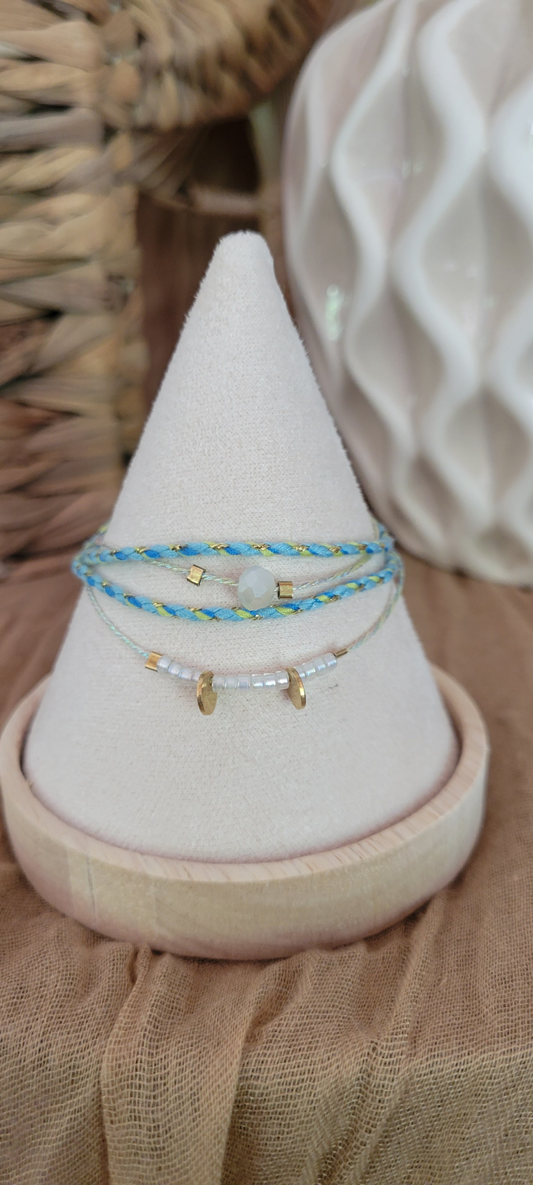 Ce bracelet double tour couleur bleu-vert a l'esprit léger et estival. Son tressage délicat mêlant fils bleu ciel, vert et doré évoque les reflets scintillants de l'eau sous le soleil. Orné de perles et de finitions discrètes, il habille votre poignet d'une touche de lumière et de rêve. Parfait pour sublimer toute vos tenues.
