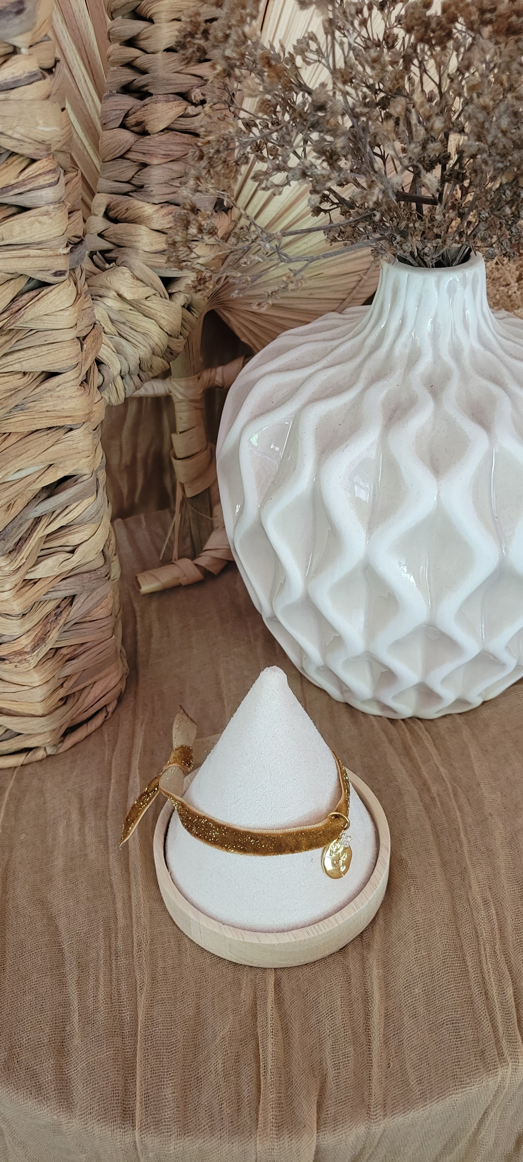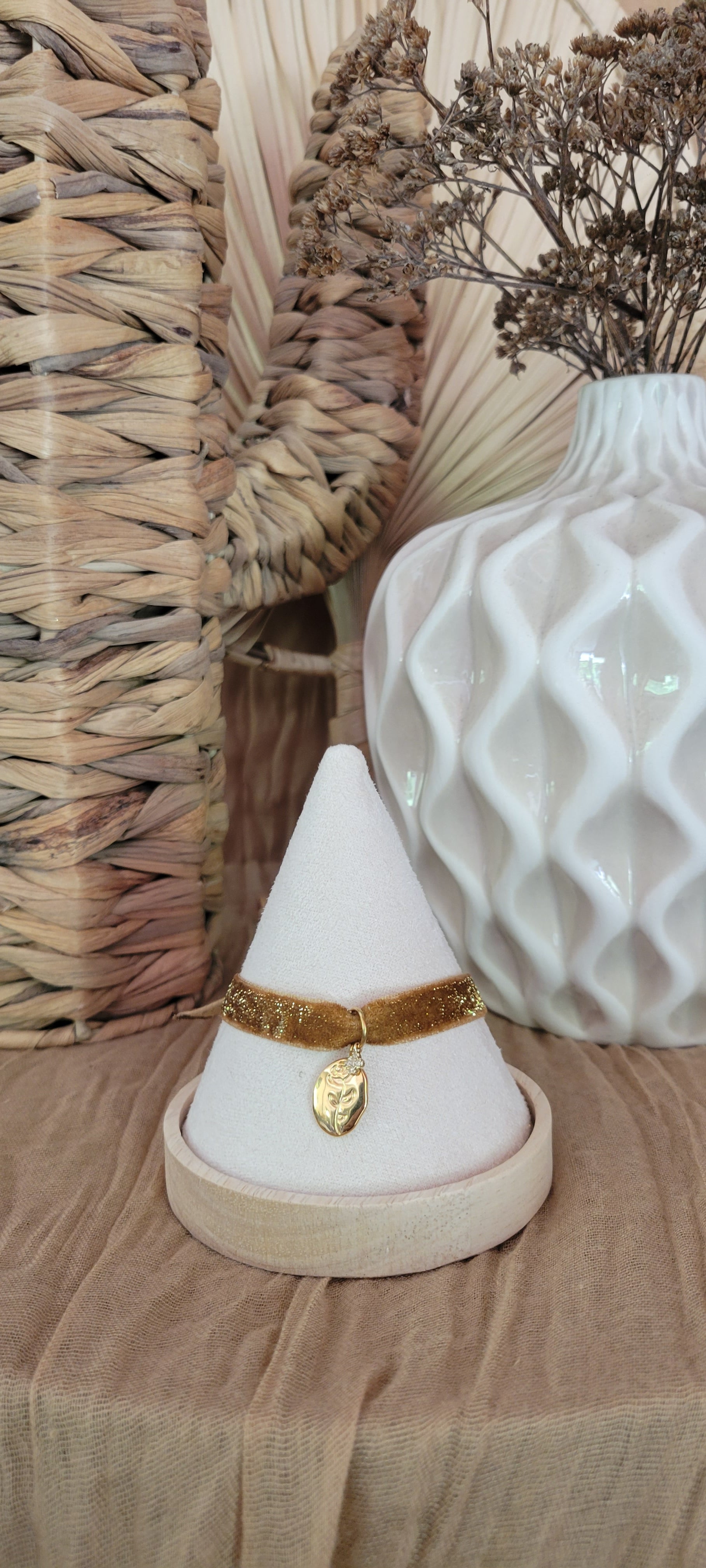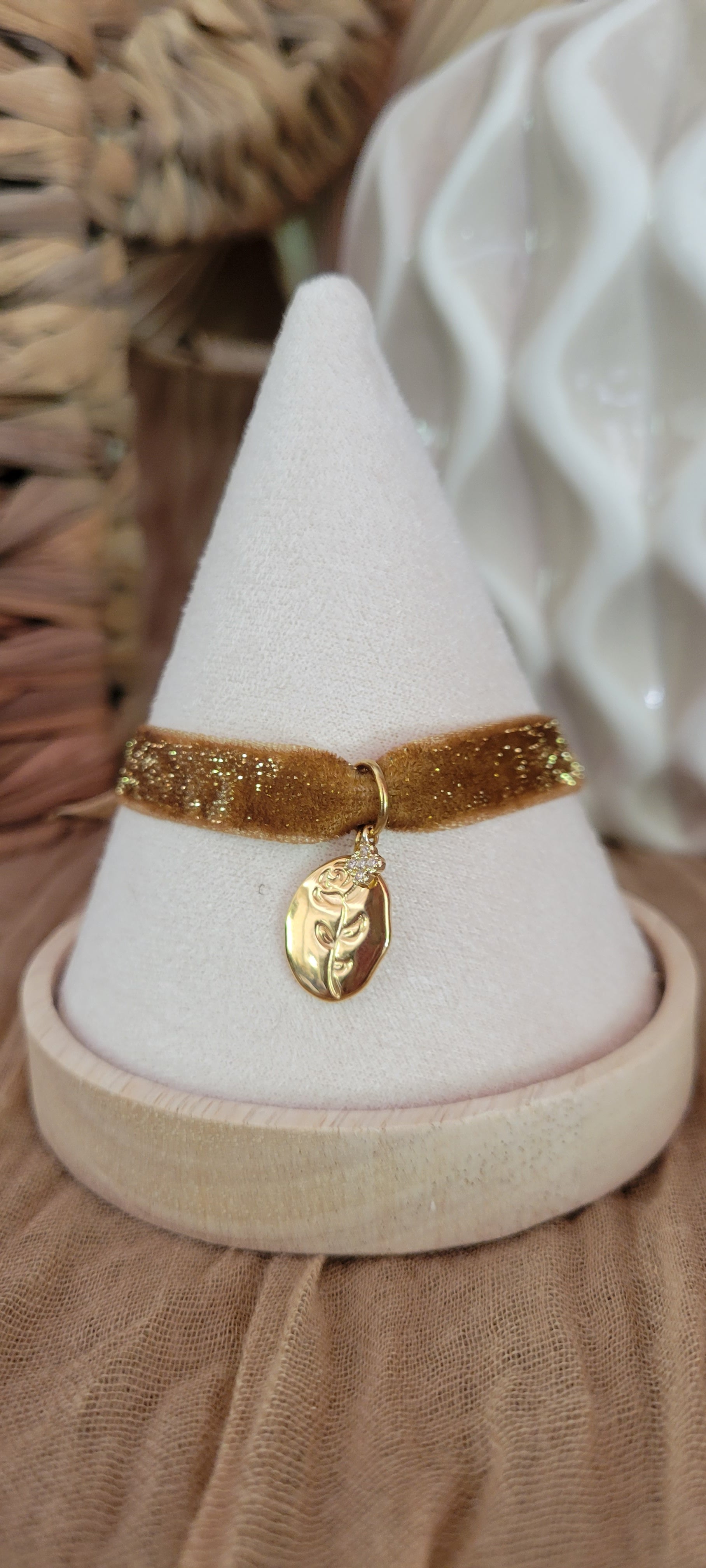 Ce bracelet délicat marie un tour de tissu marron pailleté, rappelant les premiers rayons dorés du matin, à un pendentif couleur or finement sculpté en forme de fleur. L’éclat subtil des paillettes capte la lumière avec douceur, tandis que la fleur en or symbolise la beauté naissante et l’élégance intemporelle. Parfait pour illuminer une tenue avec une touche naturelle et raffinée, Fleur d’Aurore est un hommage à la douceur et à la lumière qui accompagnent chaque nouveau jour. De plus, ce bracelet ne possède pas de fermoir, il s'attache a votre guise avec un jolie nœud ou bien un double tour.