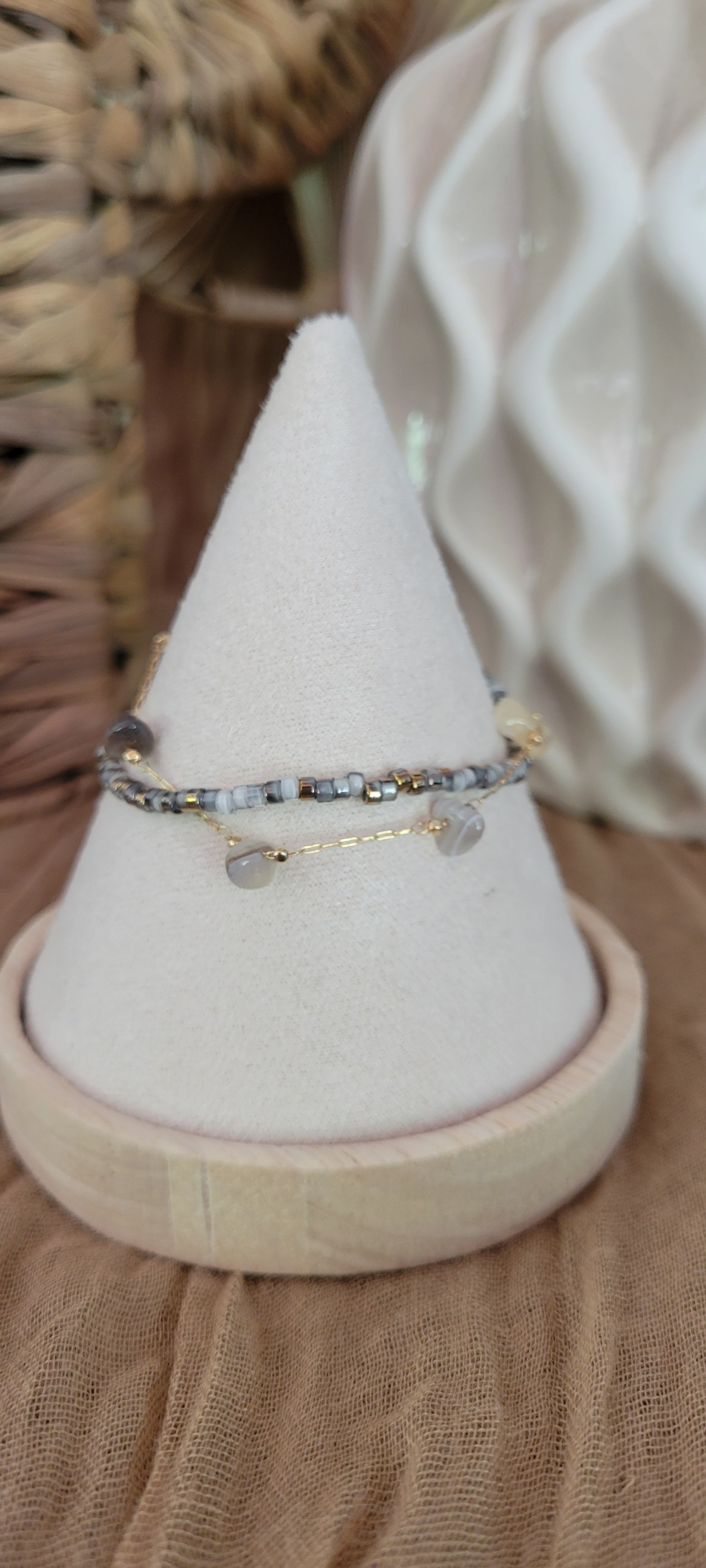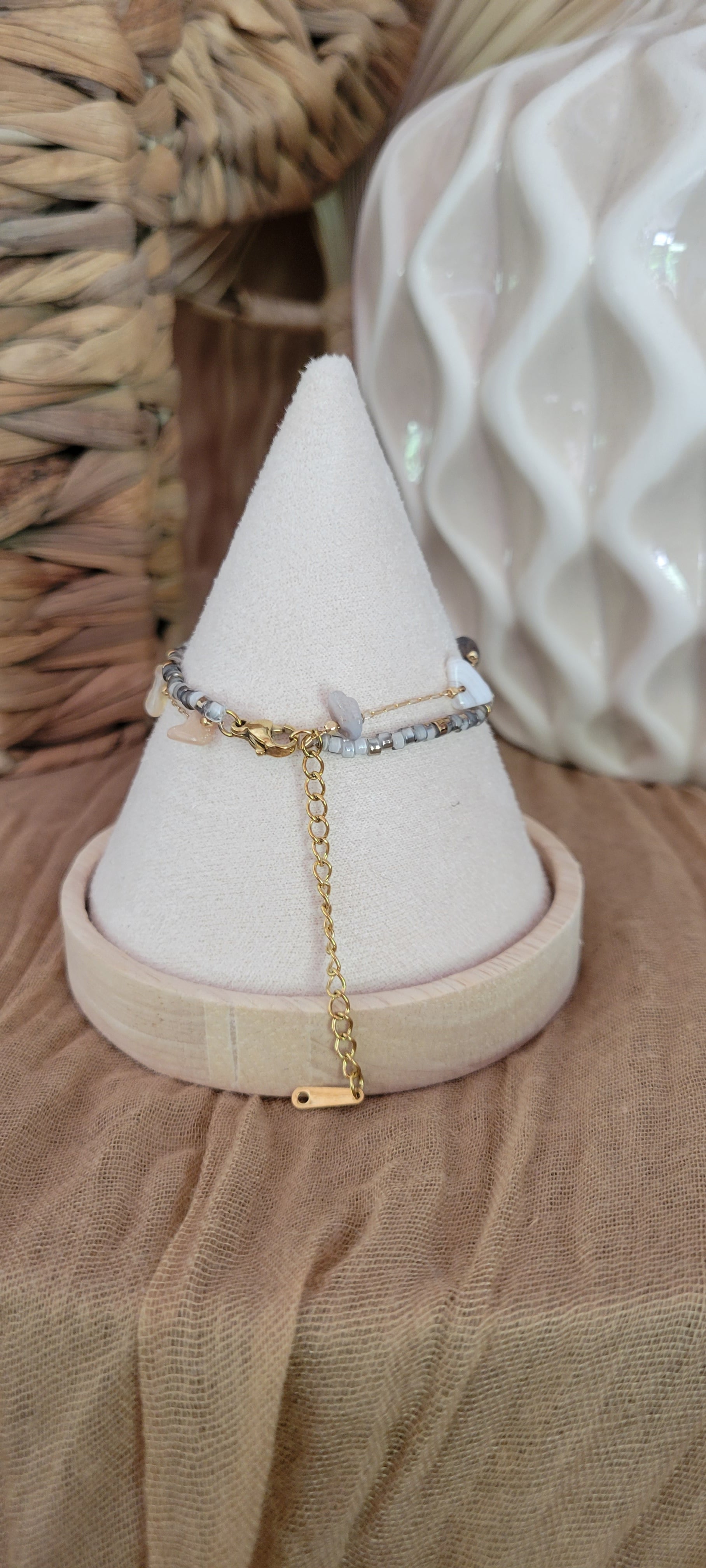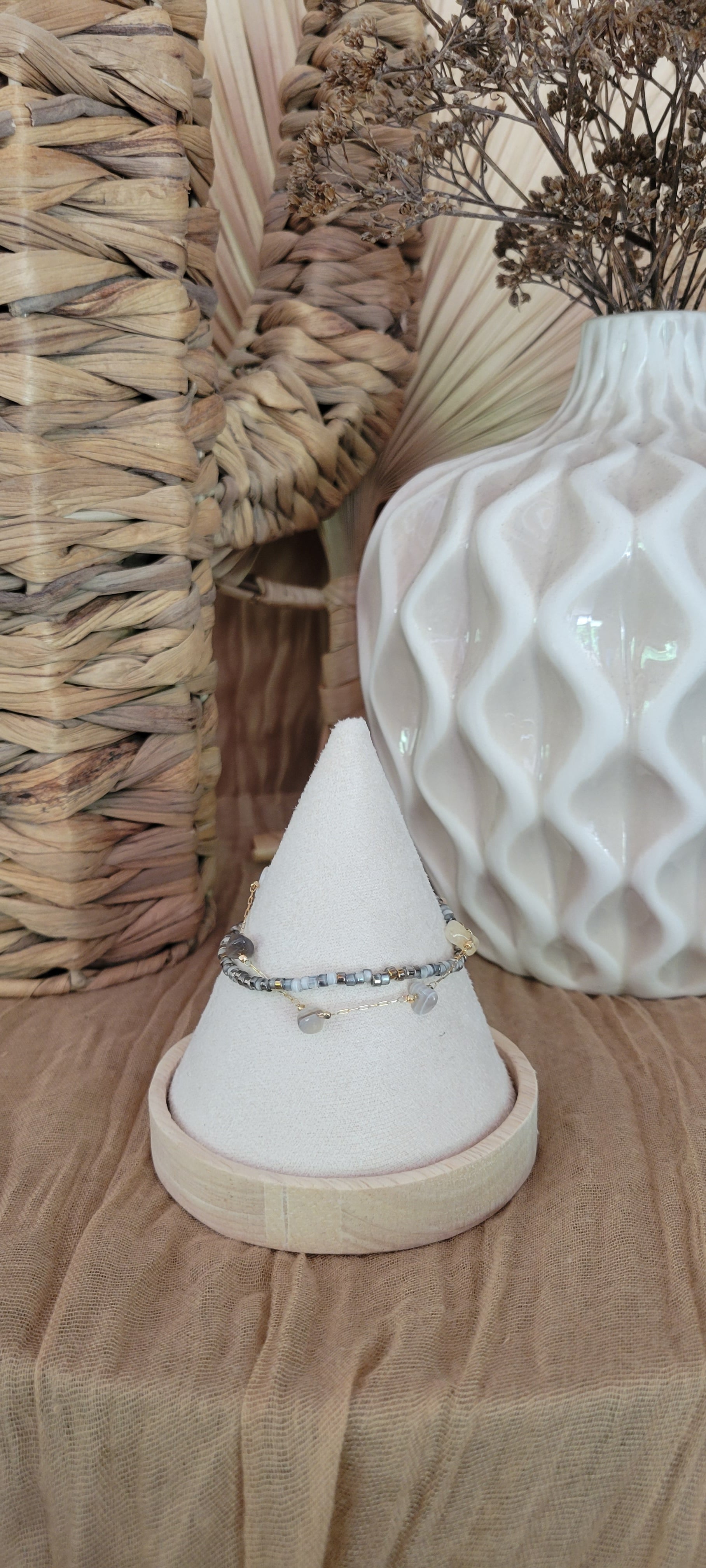 Offrez à votre poignet une touche de lumière discrète et sophistiqué avec le bracelet Grisélia. Ce bijou a deux tours mêle harmonieusement l'éclat doux des perles grisâtres et la brillance délicate du fil fin doré, créant un contraste à la fois élégant et moderne. Le second tour avec des pierres permet de rajouter une touche précieuse et raffinée.