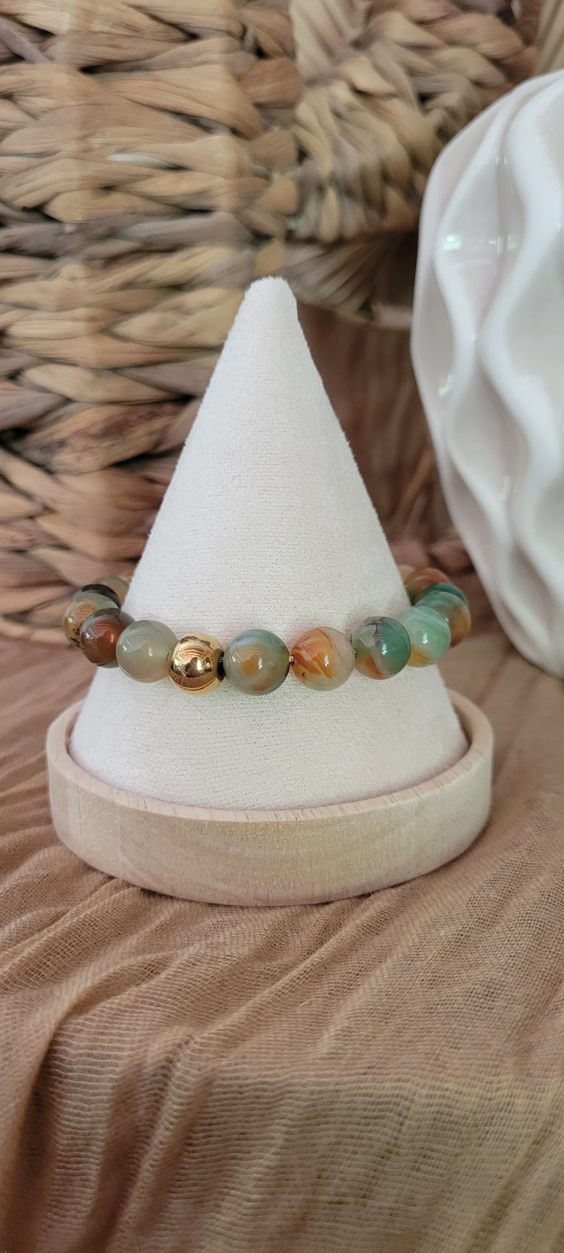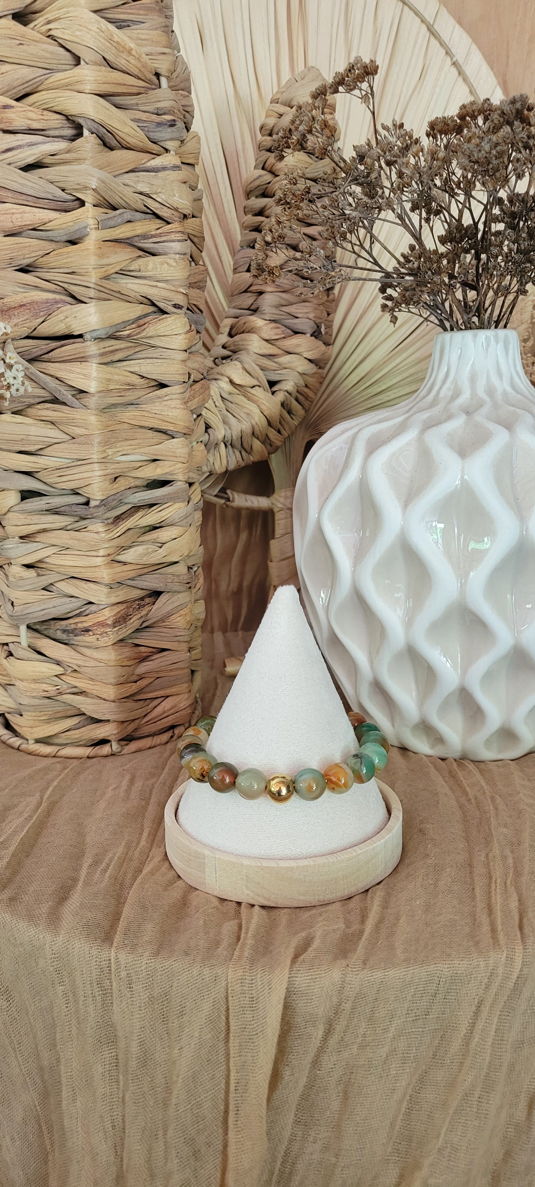 Ce bracelet majestueux se compose de grosses perles aux teintes vert clair et blanc immaculé, rehaussées par une perle dorée centrale qui apporte une touche de prestige et d’élégance. Inspiré par la noblesse du jade, symbole de pureté, de sagesse et de puissance, Jade Impérial incarne l’équilibre parfait entre raffinement naturel et éclat royal. Un bijou unique, pensé pour celles qui souhaitent porter la grandeur avec subtilité. Pour un ensemble harmonieux et raffiné, découvrez aussi notre collier assorti aux mêmes pierres précieuses, qui sublimera votre style avec élégance : JADE ENCHANTÉ.
