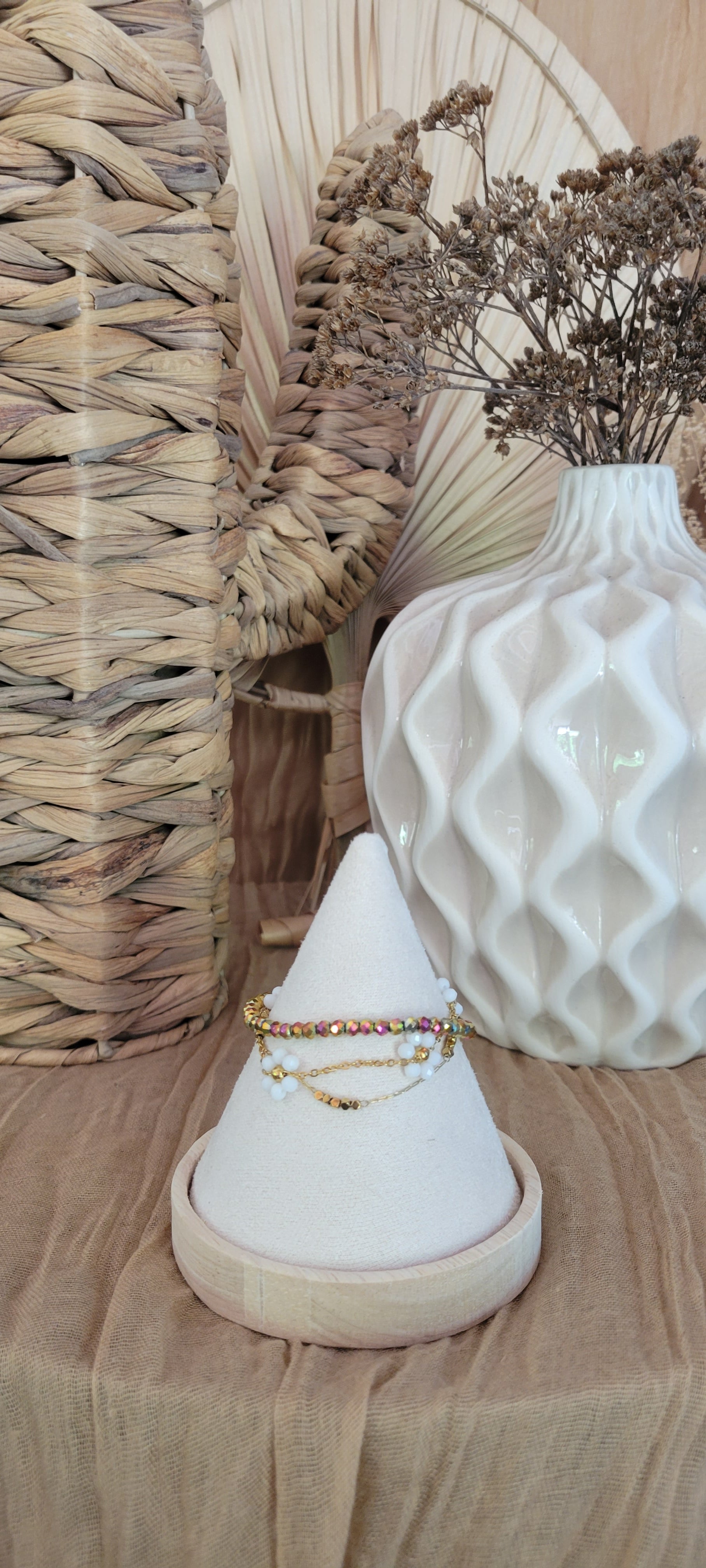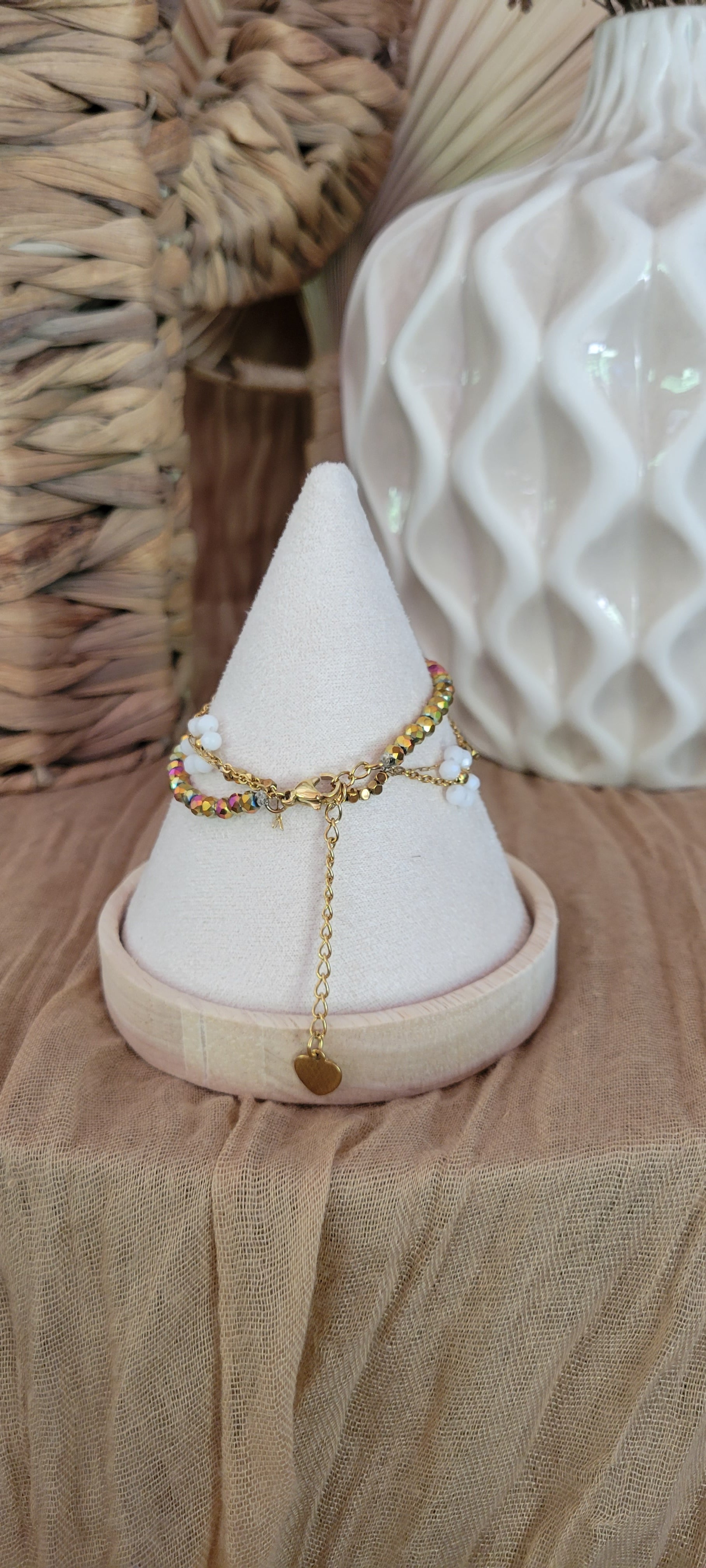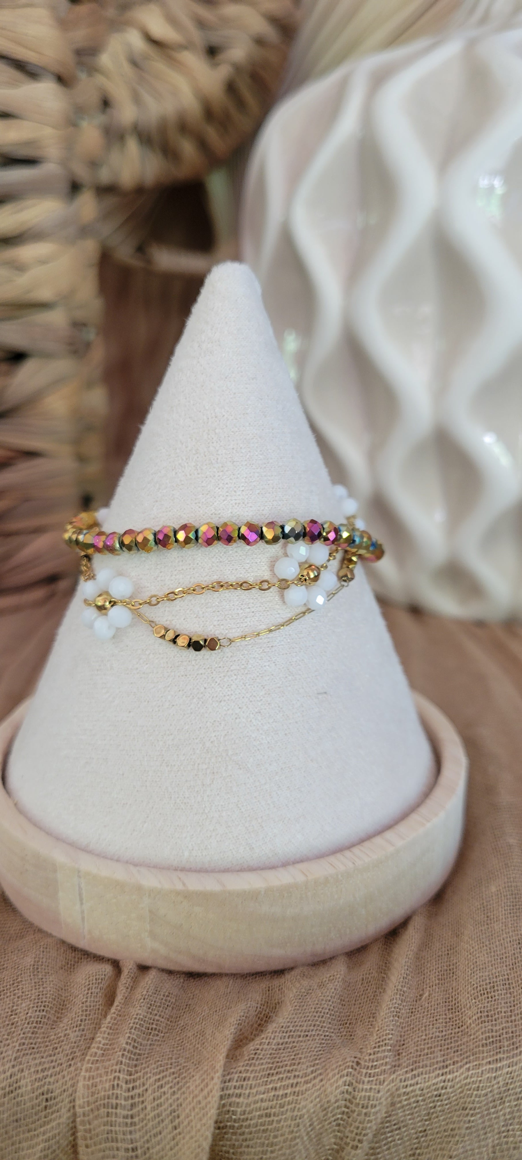 Ce bracelet délicat allie la lumière dorée à la douceur des petites fleurs blanches créant un bijou à la fois raffiné et plein de poésie. Il est composé de trois éléments un tour de perle rouge-vert, d'un tour de fleur blanche et un tour de bracelet fin dorée. Chaque détail évoque un jardin baigné de soleil où la beauté naturelle se mêle à l'élégance intemporelle.