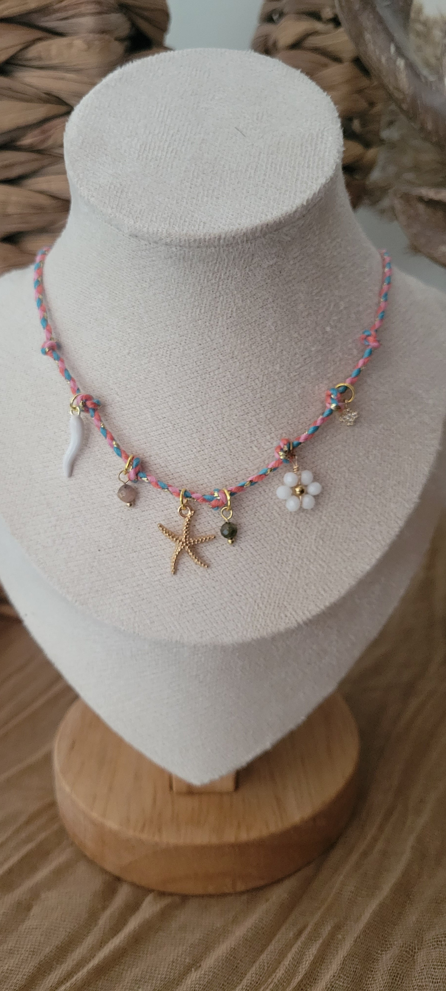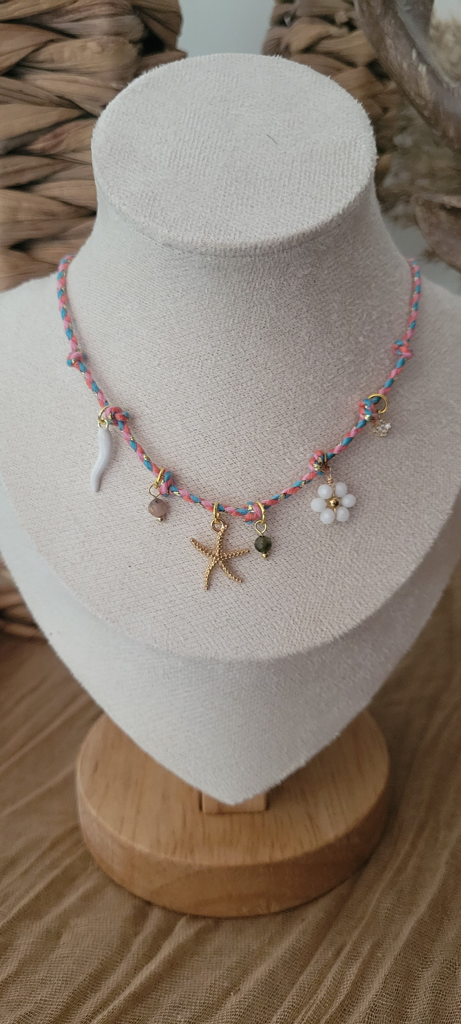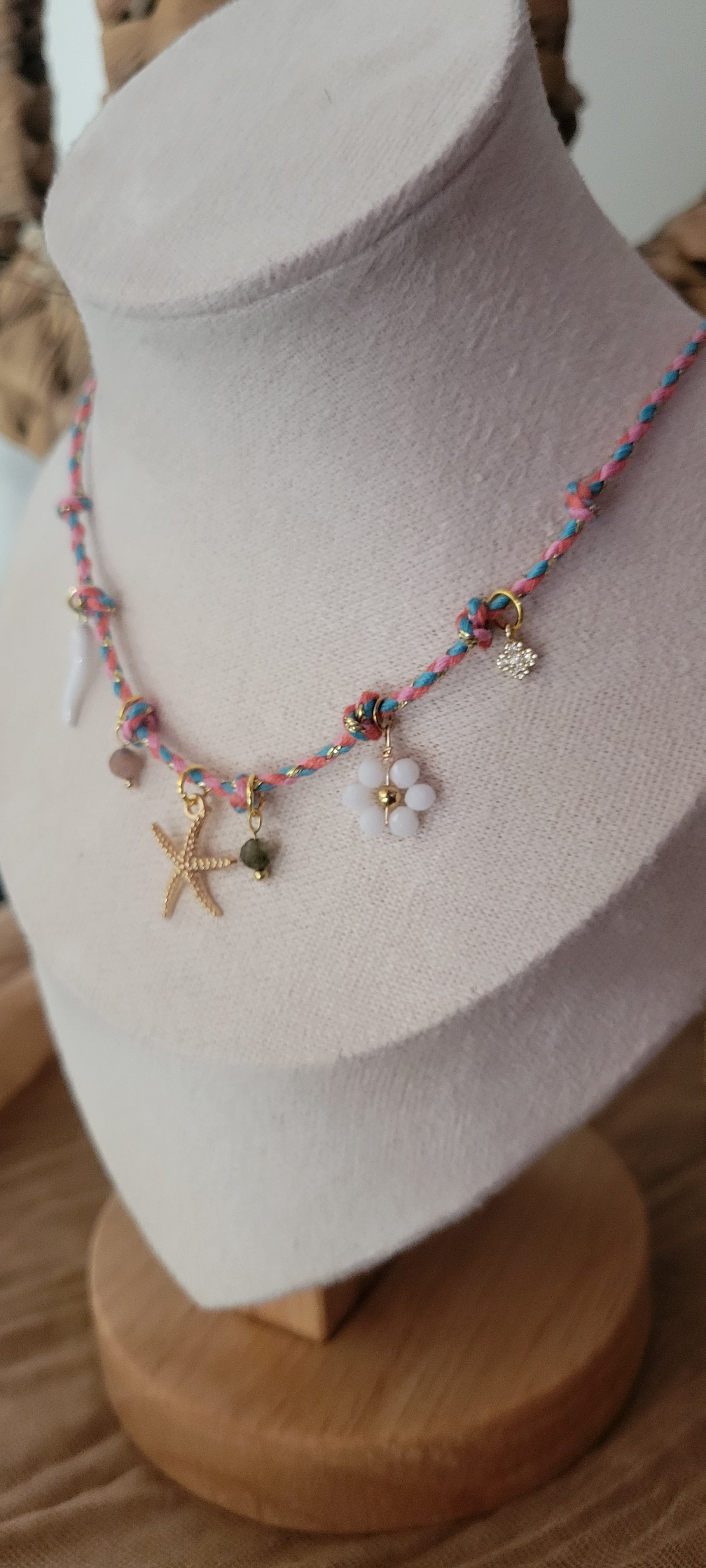 Naïa est un souffle d'été tressé autour du cou : une corde en coton mêle tendrement le rose xorail, le bleu lagon, le rouge et le doré comme quatre vagues qui s'épousent. Sur ce ruban marin dansent cinq petits trésors dorés. Son esprit bohème-chic invite à la liberté : prenez le large, sentez le sable sous vos pieds nus, laissez le vent léger murmurer son nom... et le colier Naïa deviendra votre souvenir indélébile d'aventures.
