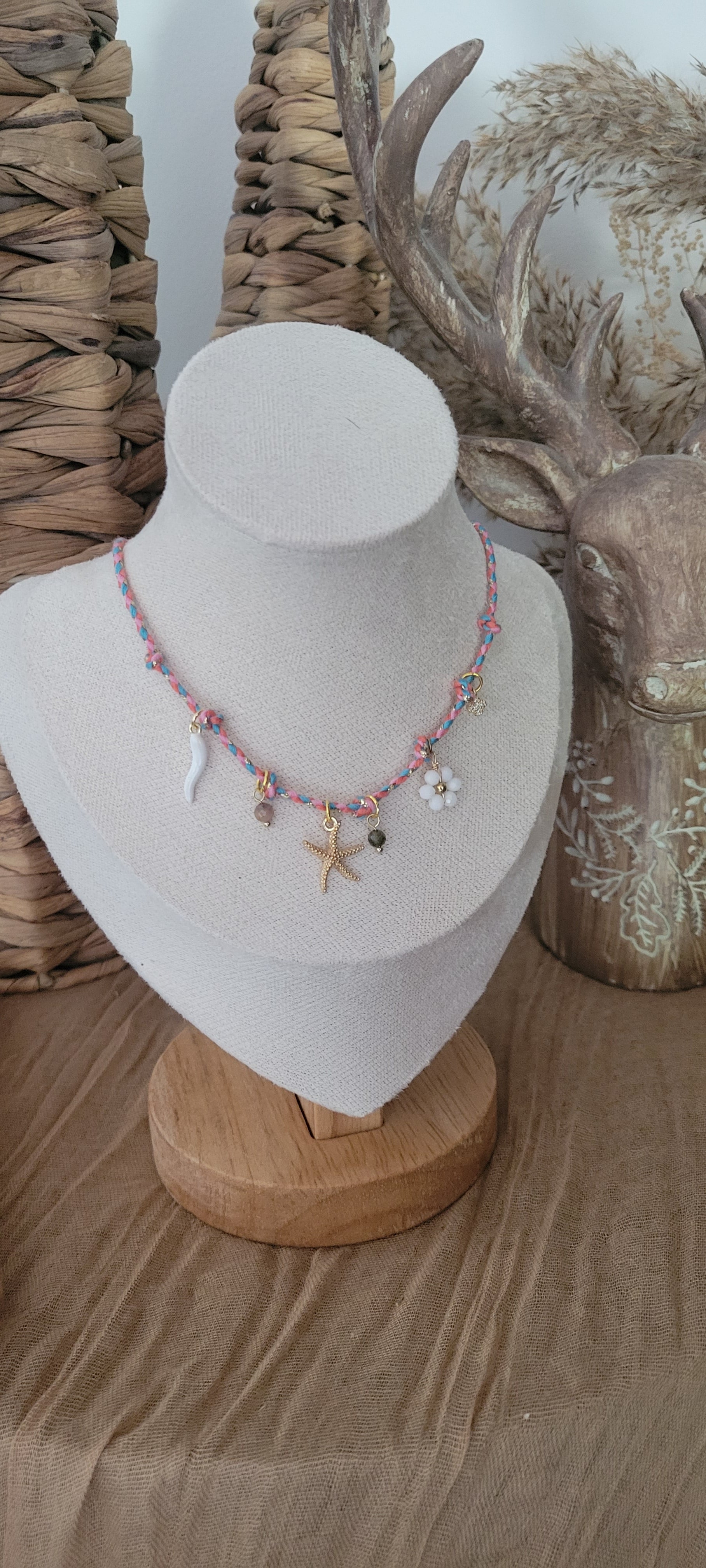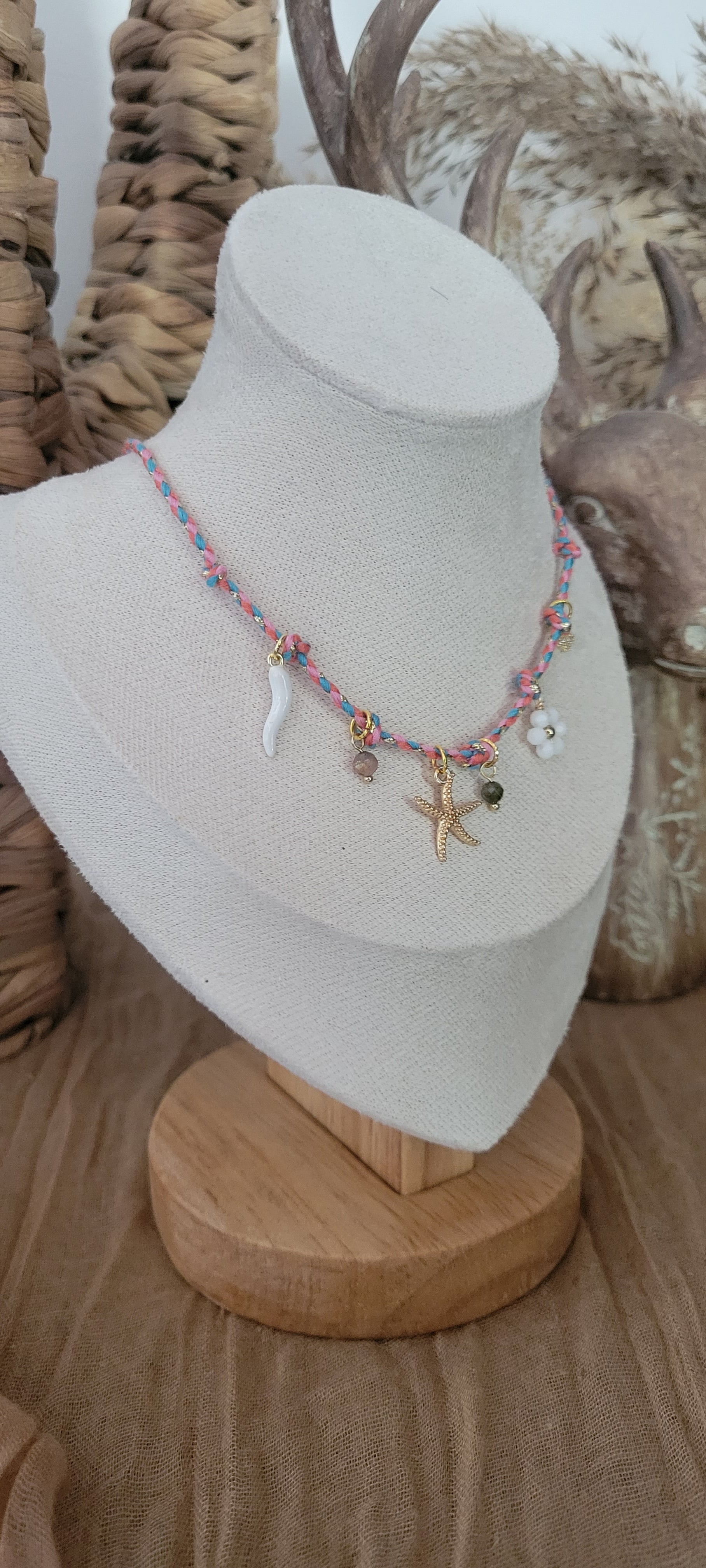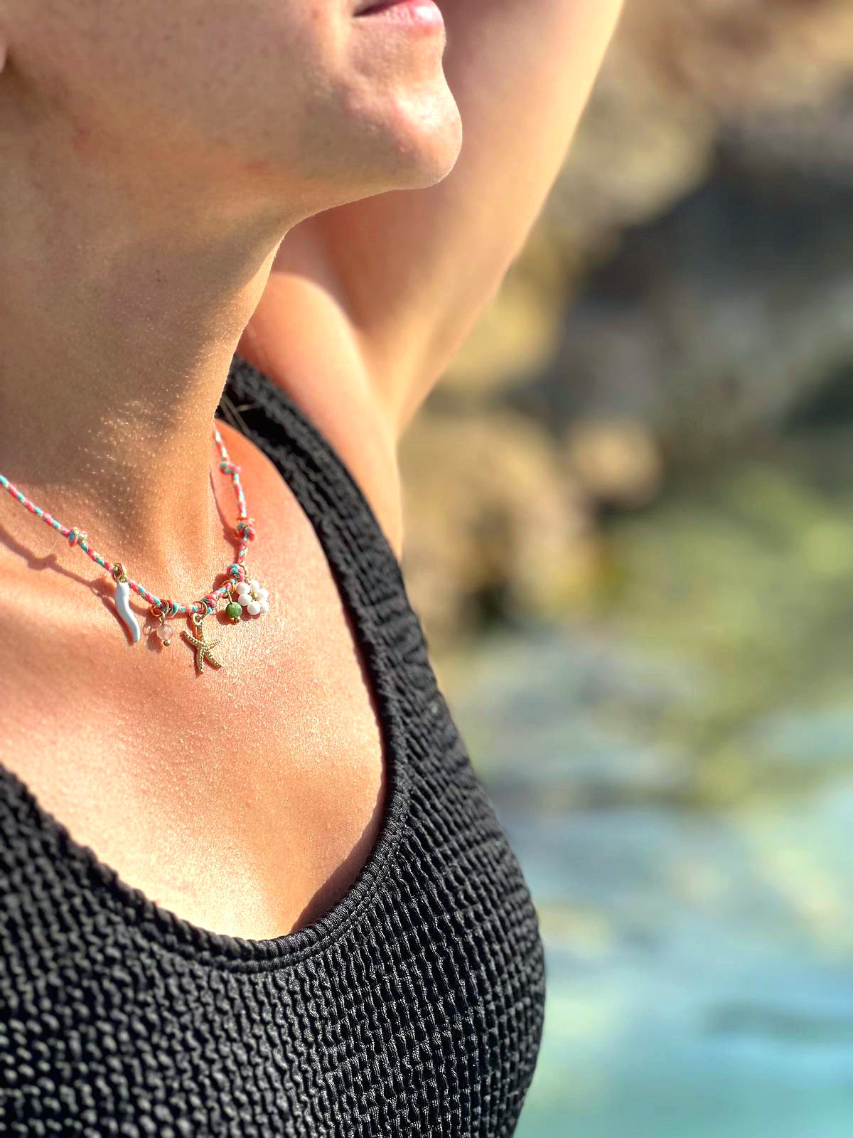 Naïa est un souffle d'été tressé autour du cou : une corde en coton mêle tendrement le rose xorail, le bleu lagon, le rouge et le doré comme quatre vagues qui s'épousent. Sur ce ruban marin dansent cinq petits trésors dorés. Son esprit bohème-chic invite à la liberté : prenez le large, sentez le sable sous vos pieds nus, laissez le vent léger murmurer son nom... et le colier Naïa deviendra votre souvenir indélébile d'aventures.