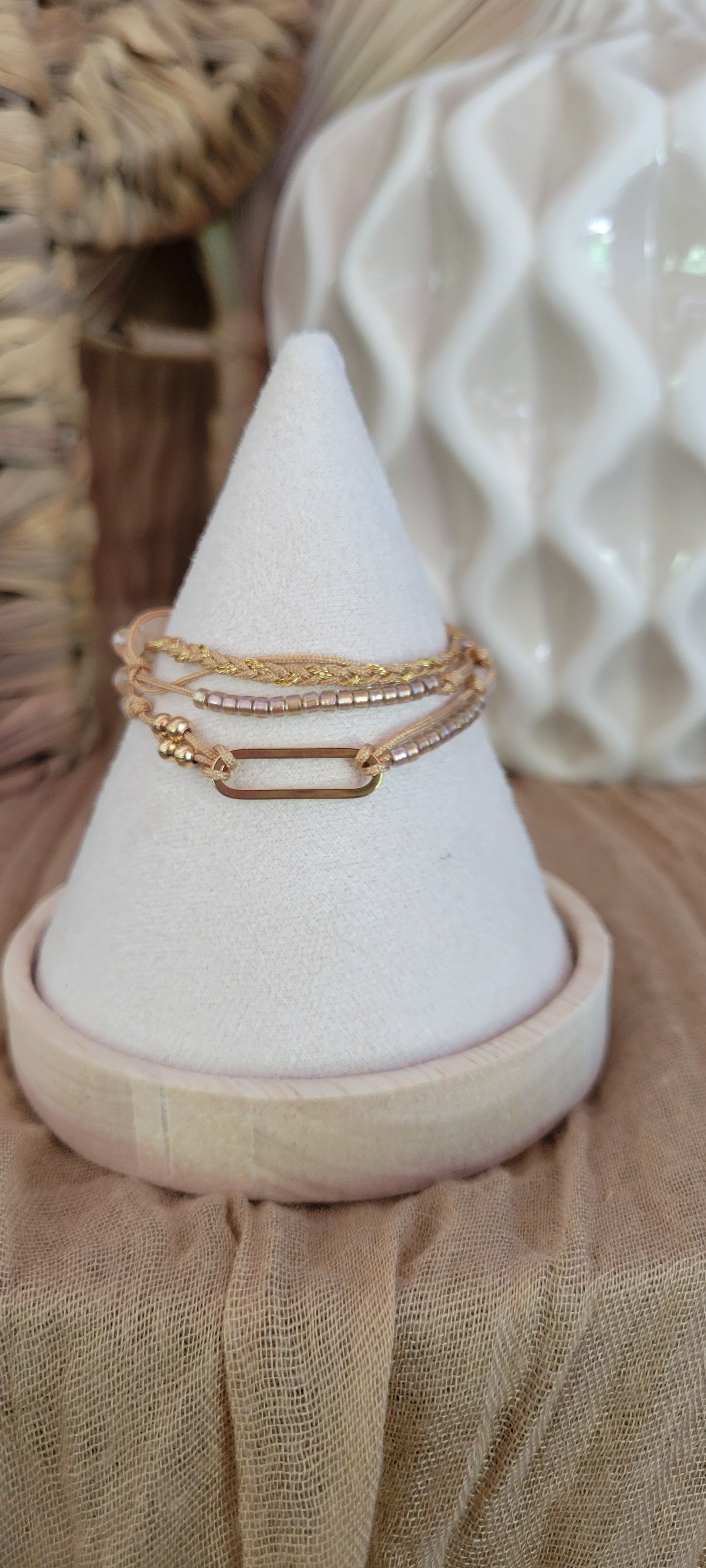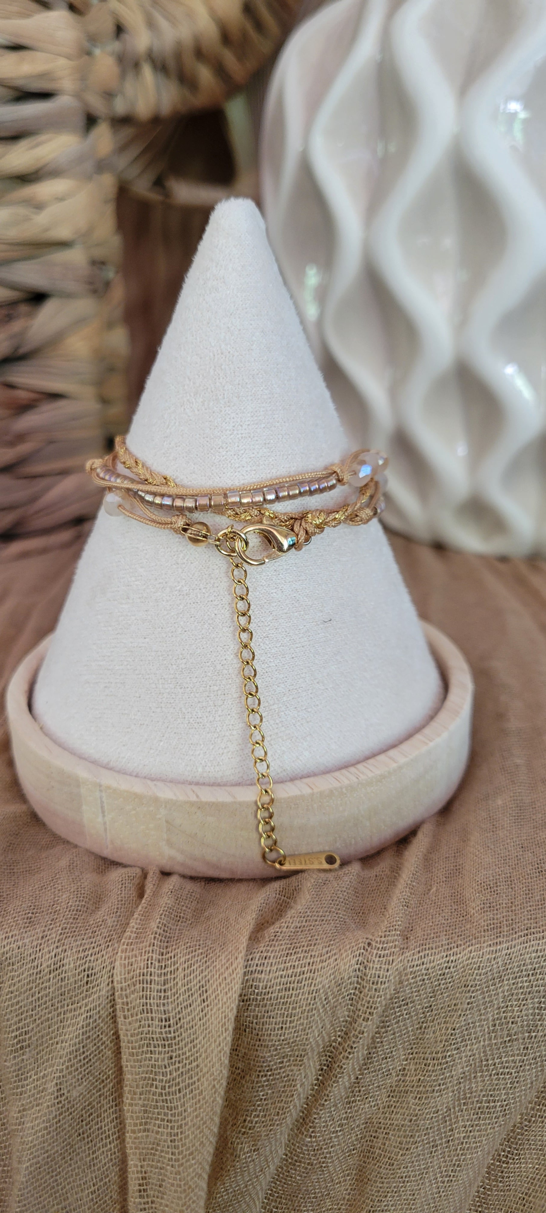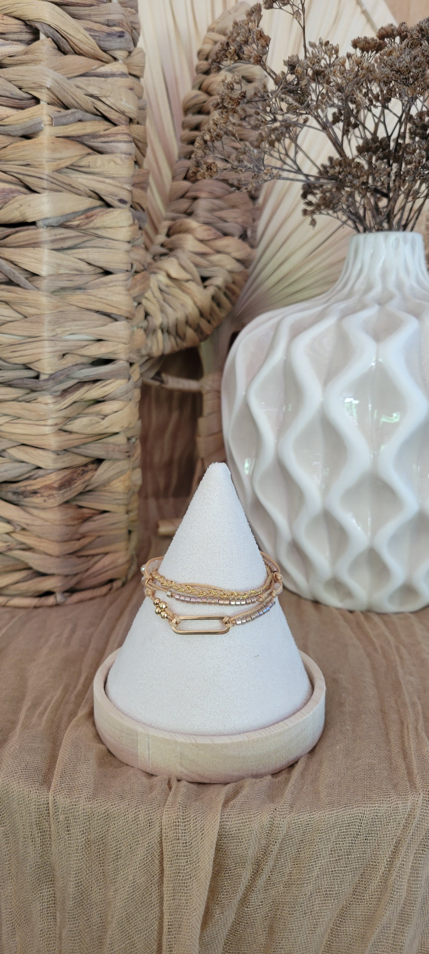 Laissez-vous séduire par Soléa, un bracelet trois tours composé de perles fines, de fils tressés et de touches dorées. Il capte la lumière avec élégance et douceur. A porter seul ou en accumulation, soléa modernité et raffinement. Un bijou lumineux pensé pour sublimer votre quotidien comme vos occasions spéciales.