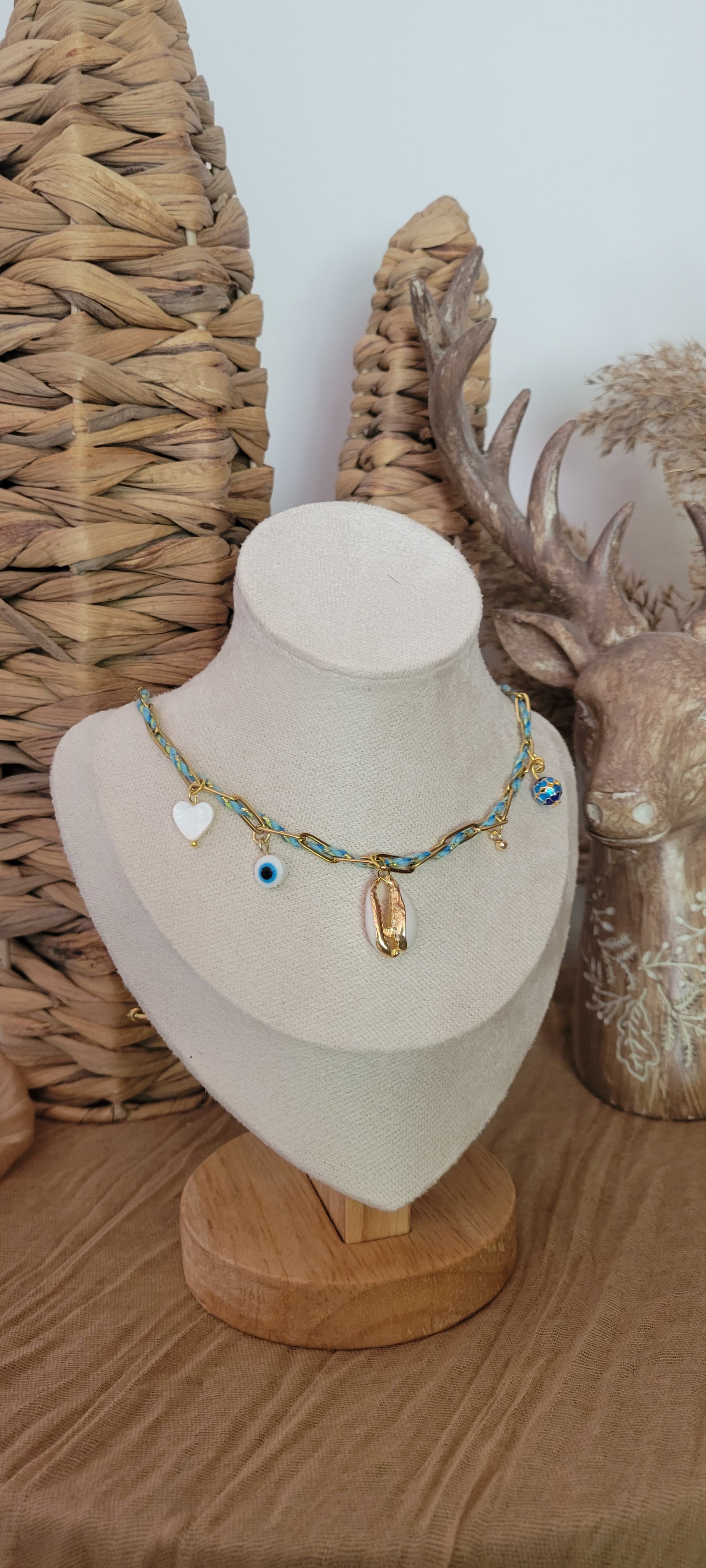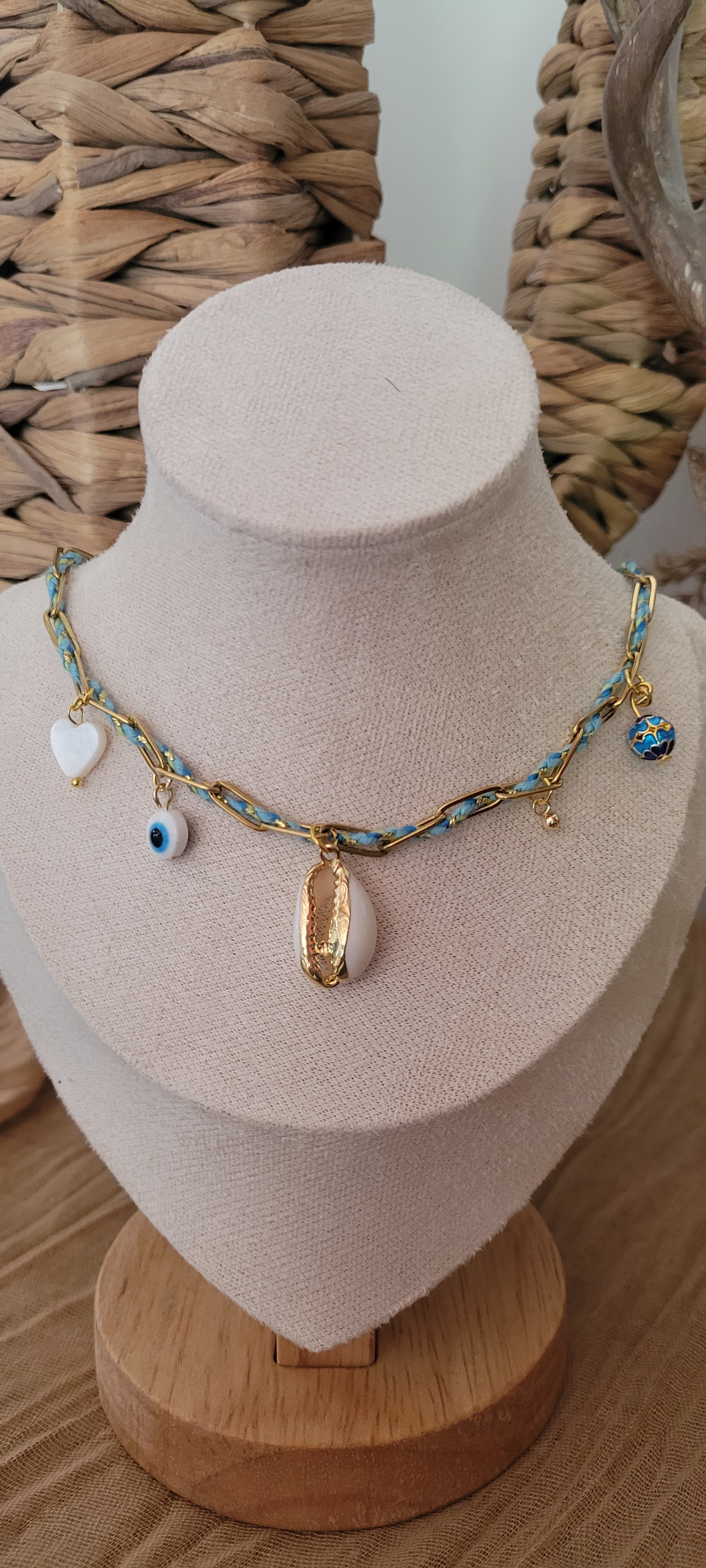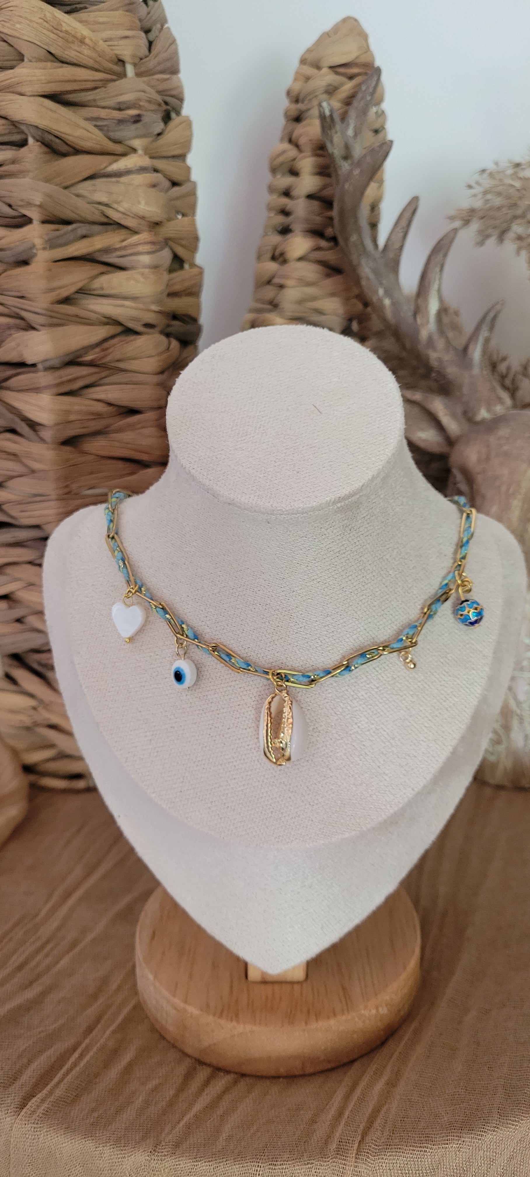 Un souffle d'été à fleur de peau. Laisse-toi envoûter par Soléna, un collier qui capture l’essence de l’été et la liberté des journées ensoleillées. Avec ses accents dorés, ses détails marins et son tressage bleu azur, ce bijou évoque les vagues caressantes, les escapades sur les îles et le chant des cigales. Chaque breloque raconte une histoire :