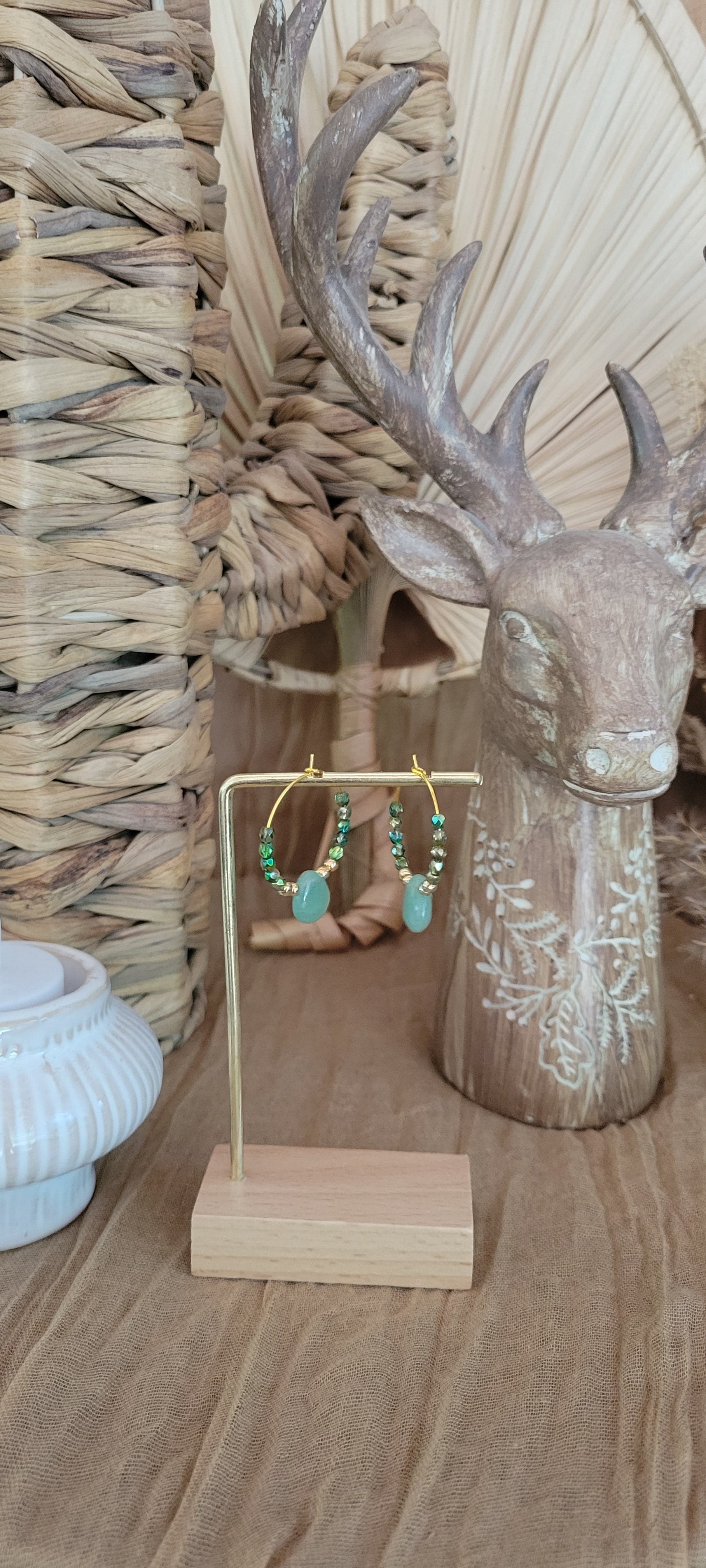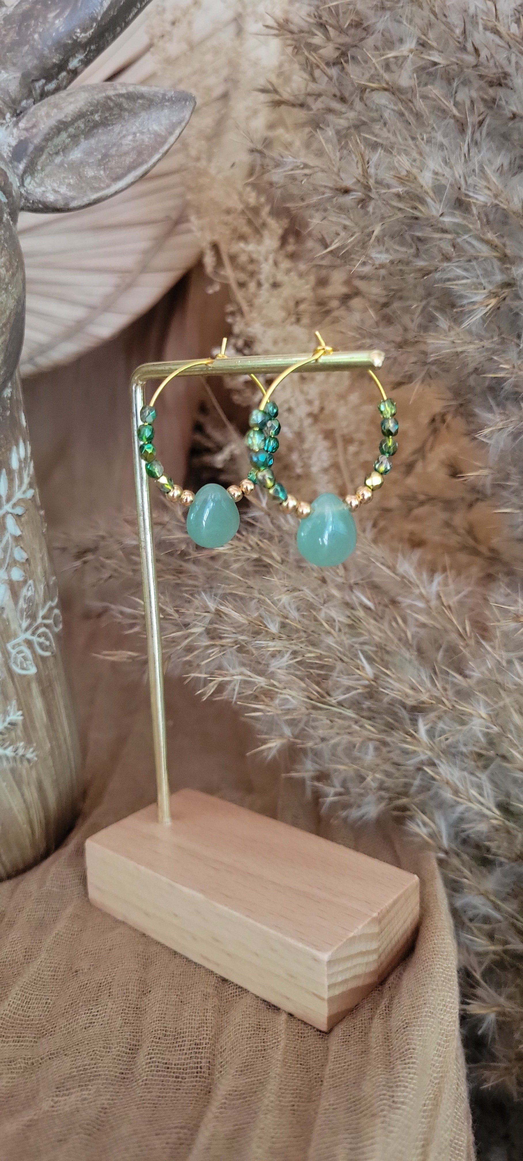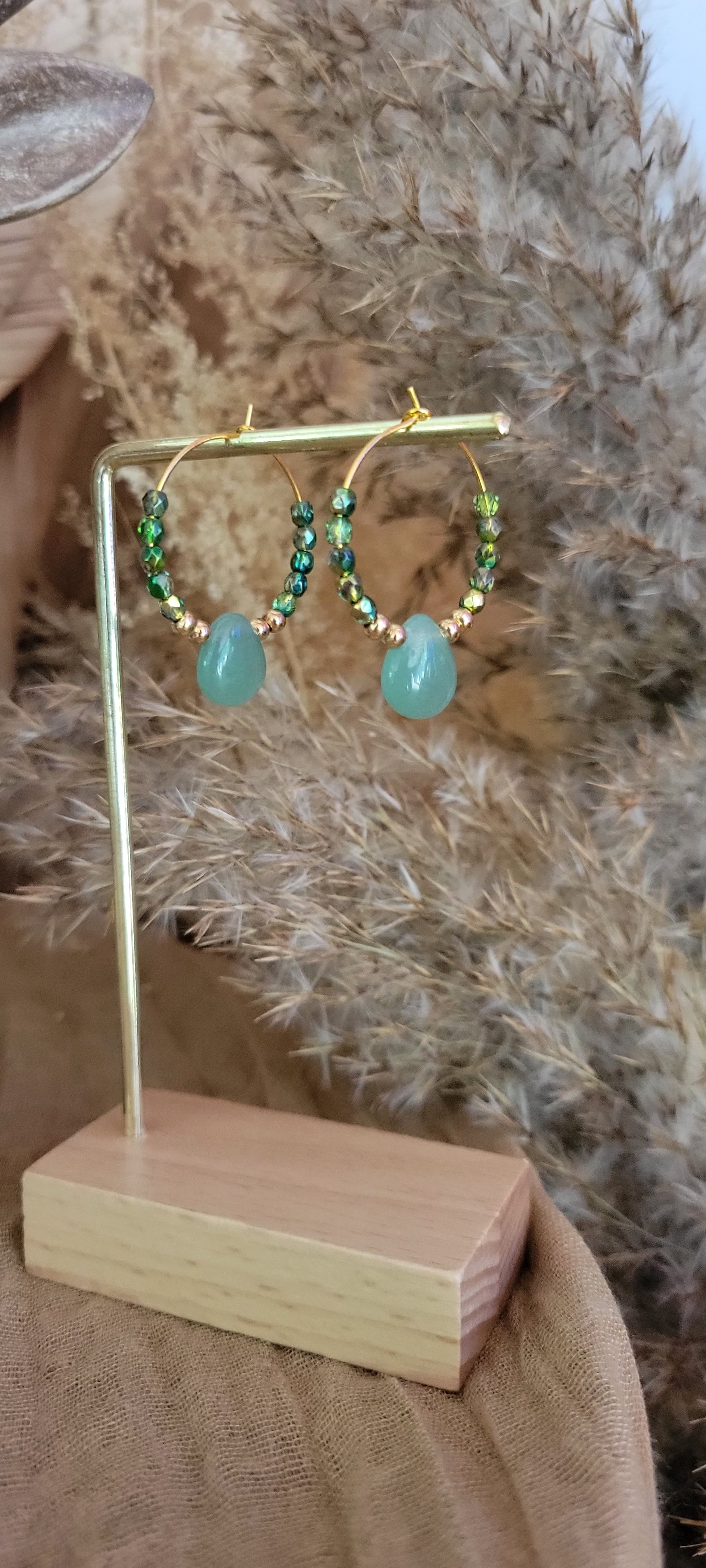 Laissez-vous séduire par Verdélia, une création où la douceur de la nature rencontre la finesse du détail. Ces boucles d'oreille en acier inoxydable allient la fraîcheur d'un vert profond à la chaleur subtile des perles dorées et brillantes, pour une harmonie visuelle à la fois apaisante et lumineuse.